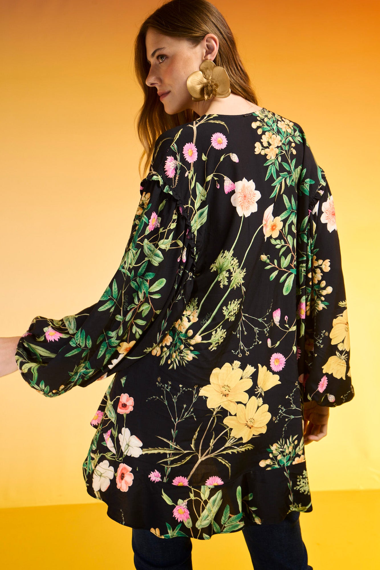 Blusa bata confeccionada em tecido plano de viscose, com estampa digital exclusiva City Blue. Possui abertura frontal com abotoamento, e as mangas são finalizadas com elástico. Destaque para os detalhes de babados franzidos nas mangas e na barra, conferindo um charme romântico ao look. Dica: Combine com calçados western e shorts ou calça para um visual fashionista cheio de estilo.