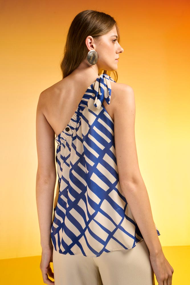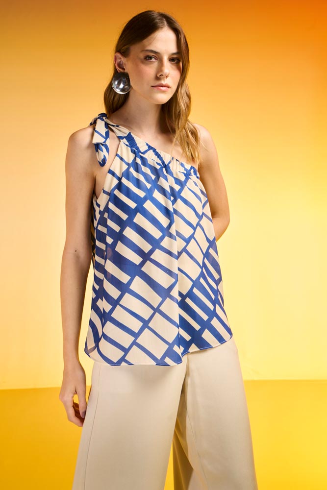 Blusa ombro único com amarração confeccionada em tecido plano. Possui modelagem solta e fresca, garantindo liberdade de movimento. Conta com forro para maior conforto e destaque para a estampa exclusiva da coleção City Blue, que traz um toque moderno. Ideal para mulheres que buscam praticidade e elegância no seu dia a dia.