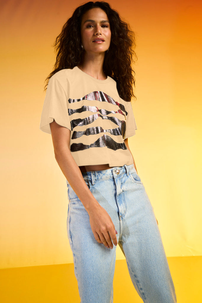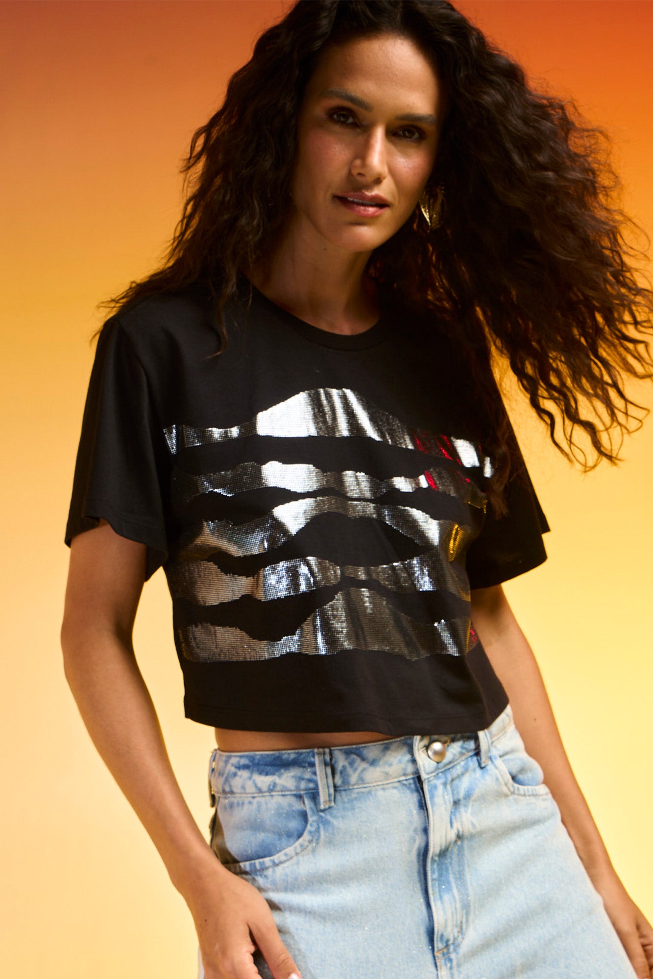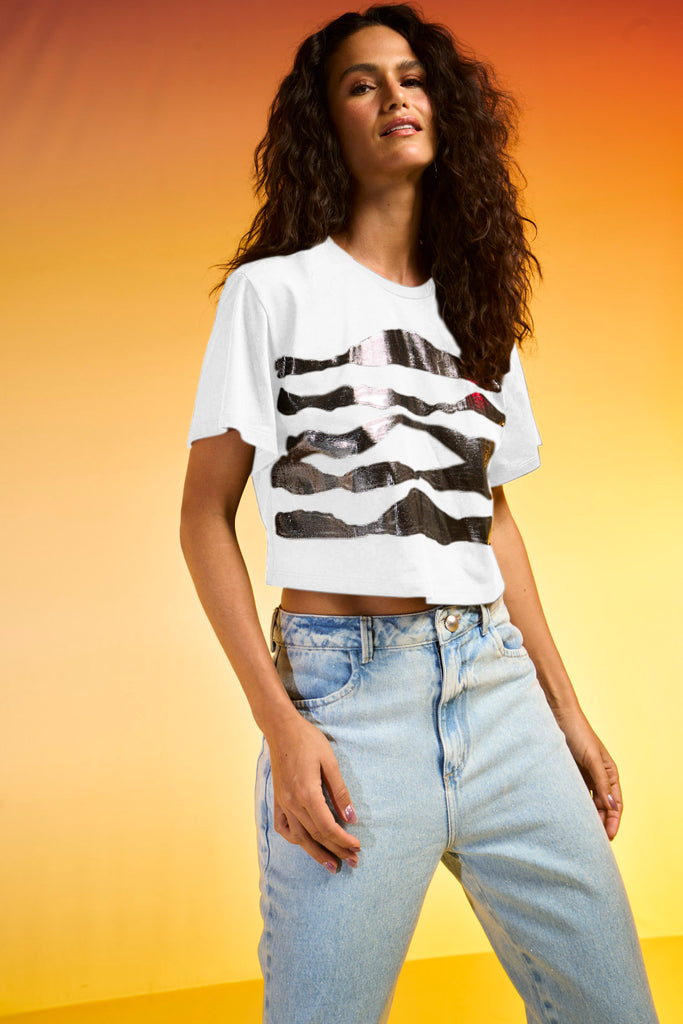 T-shirt cropped confeccionada em malha 100% algodão. Com uma aplicação exclusiva de animal print metalizado na parte frontal, ela traz um toque sofisticado e ousado à produção, elevando até os looks mais básicos aos mais elaborados.