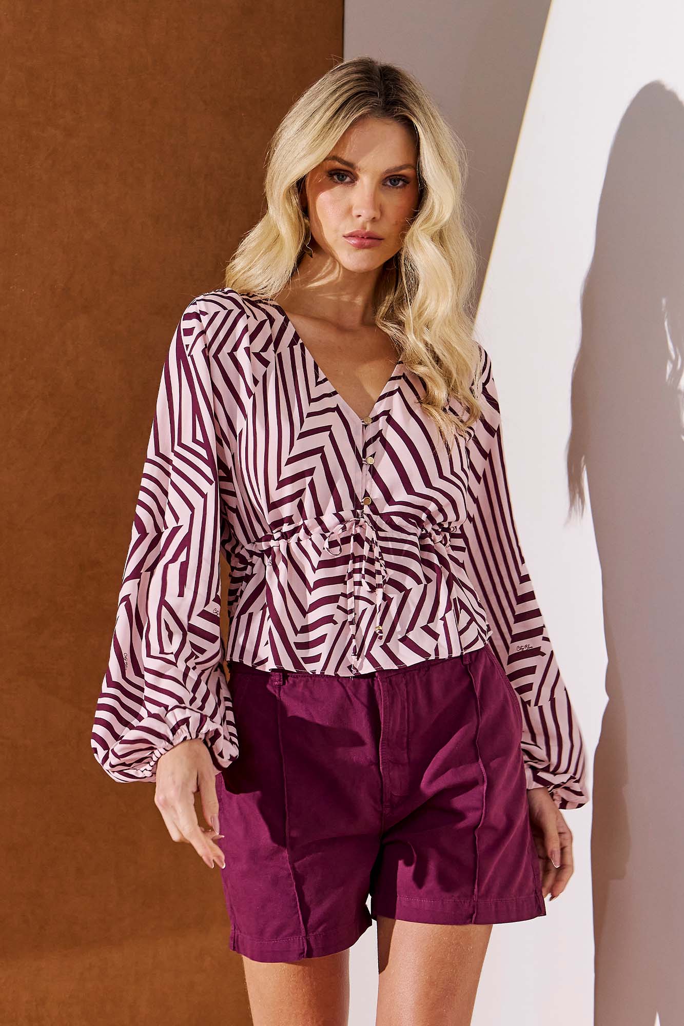 Blusa com decote em V confeccionada em viscose leve, com estampa exclusiva City Blue. Possui mangas com elástico, cintura franzida com amarração frontal e delicada abertura com botões. A barra mullet garante um toque moderno e fluido ao visual. 100% VISCOSE.