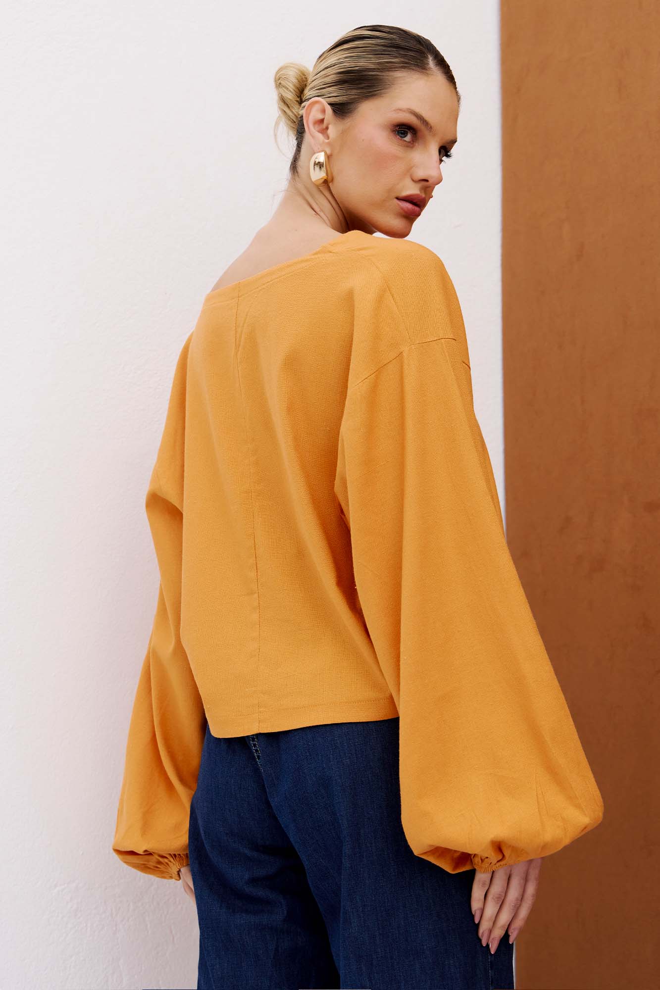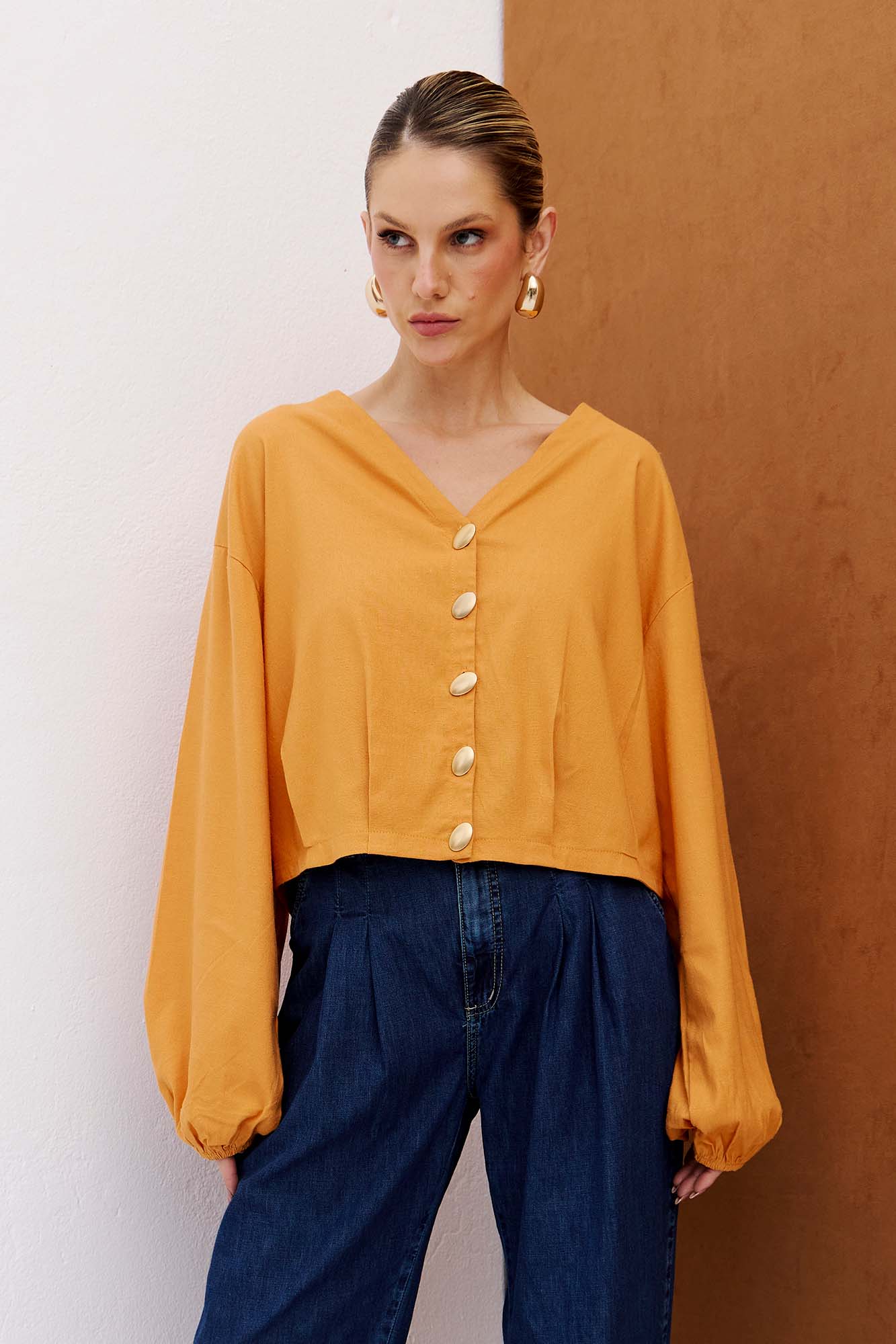 Camisa oversized confeccionada em linho. Possui decote em V, fechamento frontal por botões e pregas sutis que valorizam a silhueta. As mangas longas com elástico nos punhos garantem conforto e estilo. 87% VISCOSE 10% LINHO 2% OUTRAS FIBRAS 1% ELASTANO