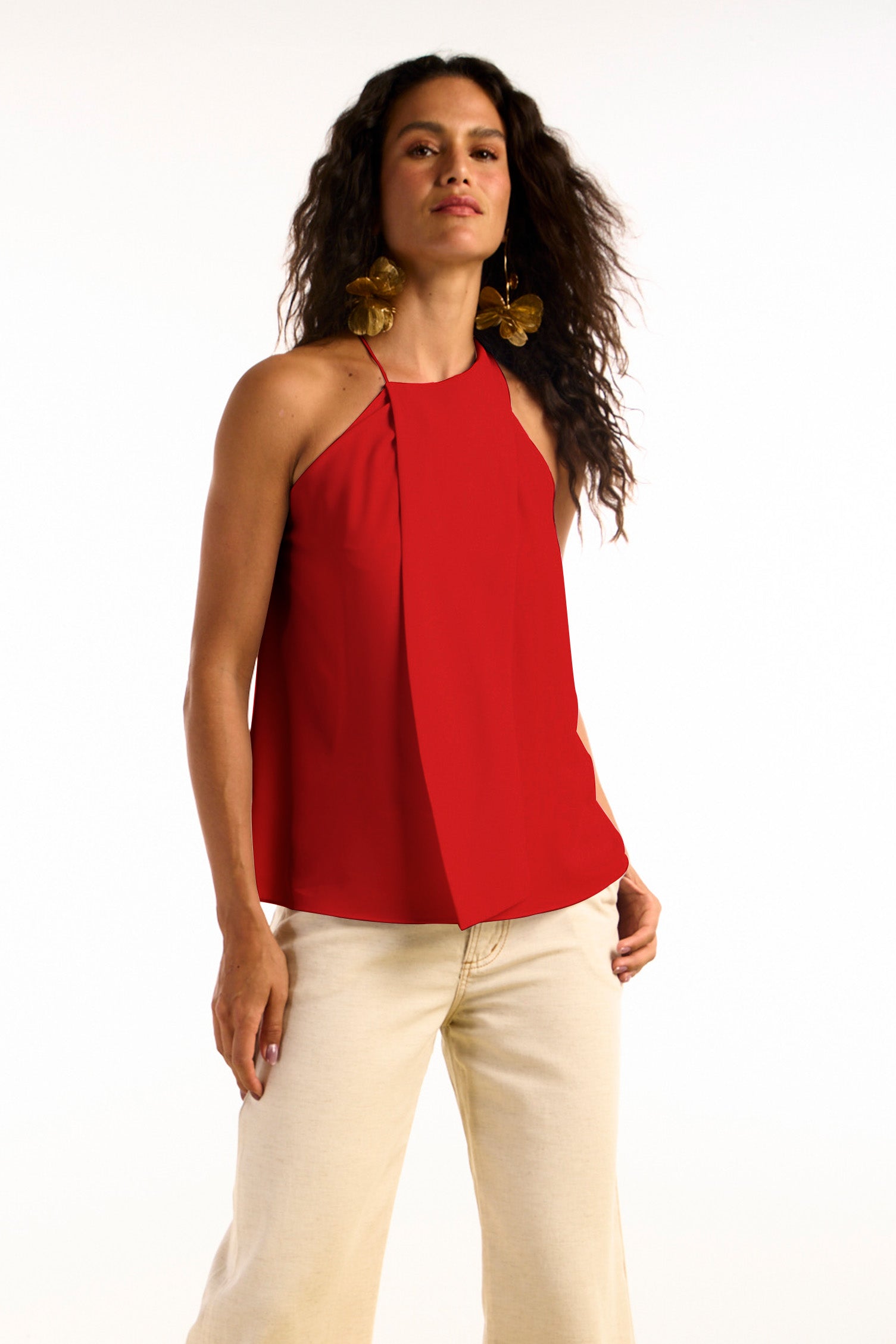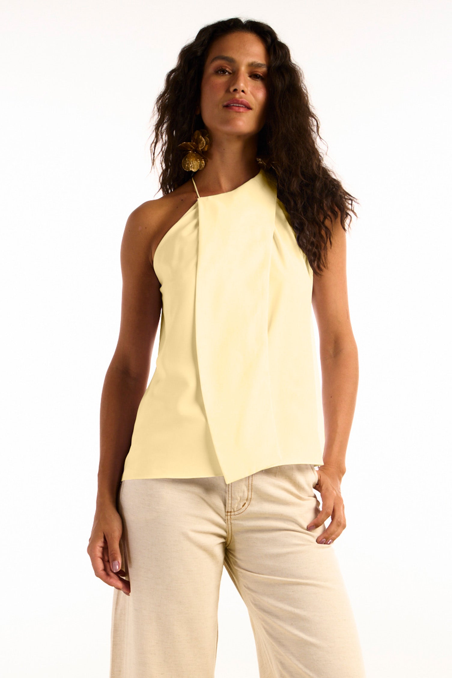 Blusa confeccionada em tecido plano, com detalhe franzido e alça delicada de elástico roliço. O design ainda conta com uma pala solta embutida no decote, conferindo modernidade e movimento à peça. Dica de look: combine com uma calça de cintura alta e sandálias de salto para um visual sofisticado e atual.