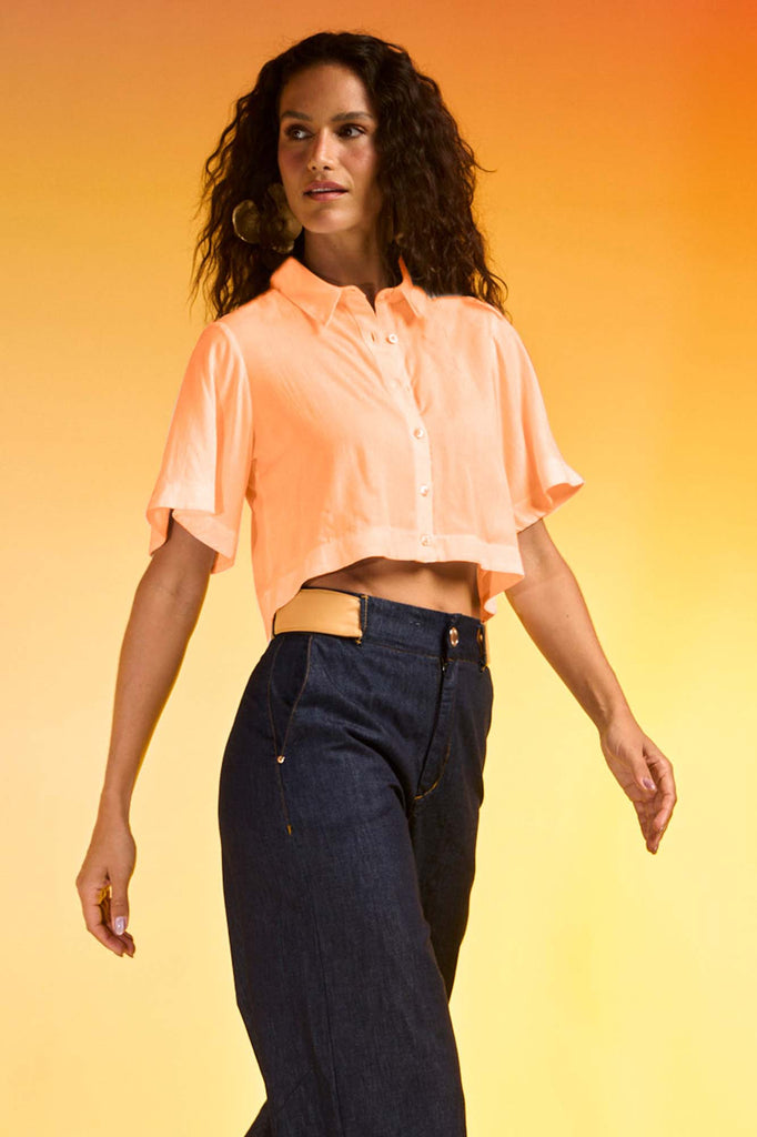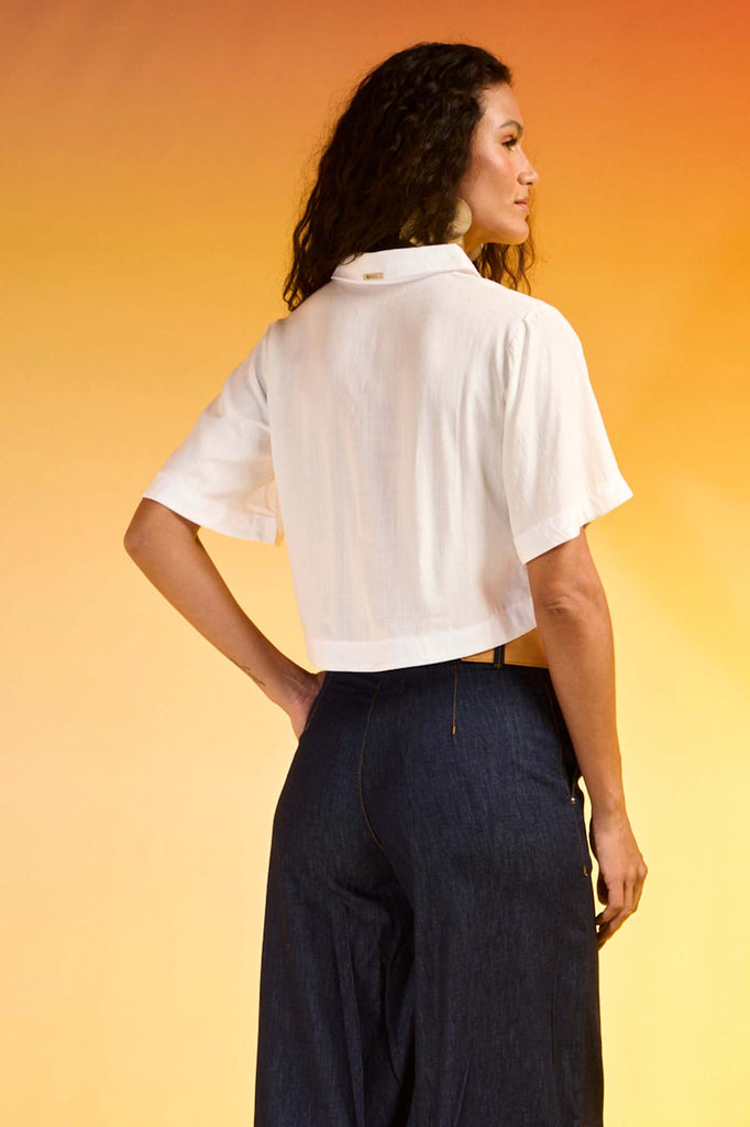 Camisa cropped City Blue confeccionada em viscolinho. Com gola de colarinho clássica e abertura frontal por botões, ela se adapta tanto ao ambiente de trabalho quanto ao dia a dia, oferecendo praticidade com sua modelagem leve e fresca.