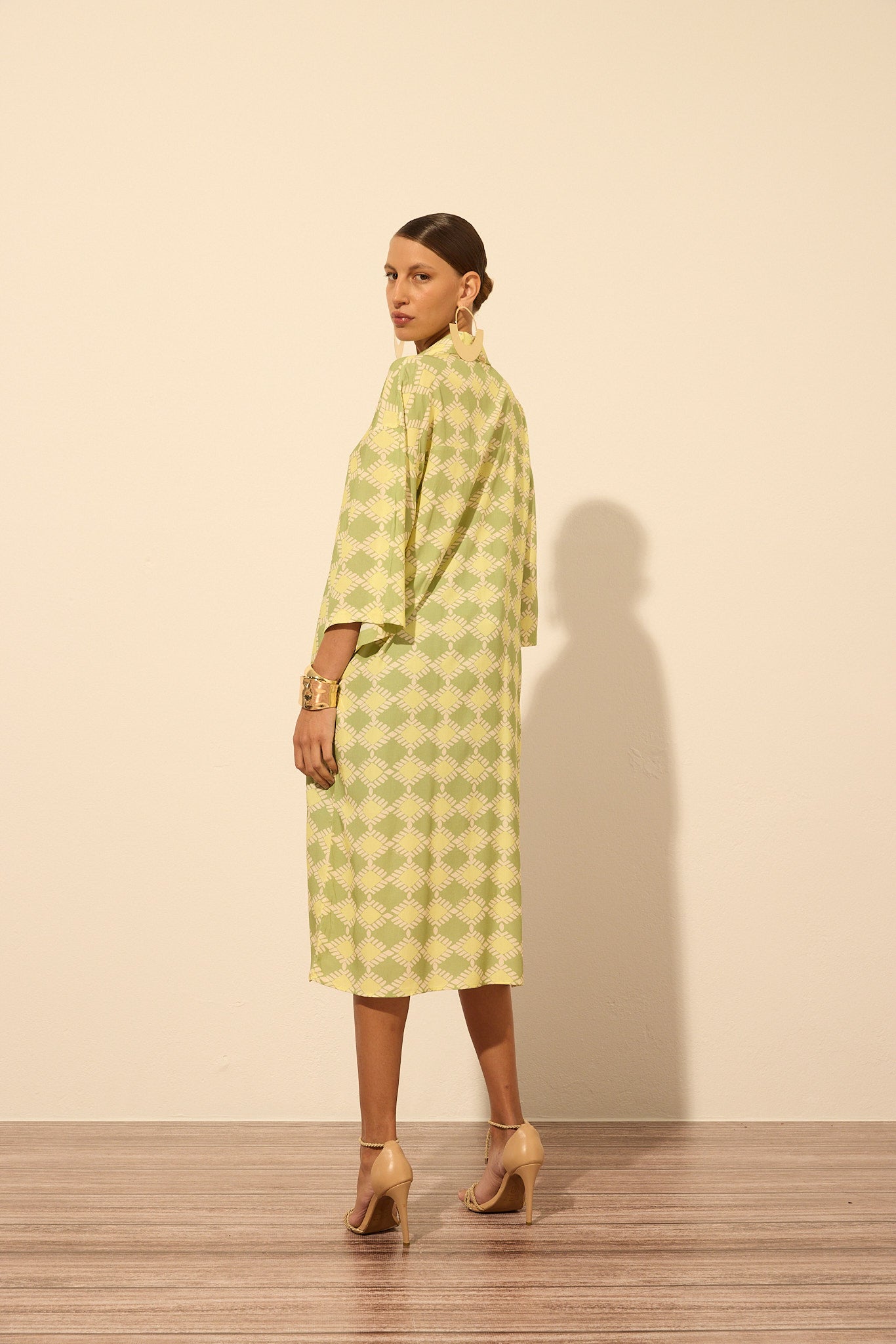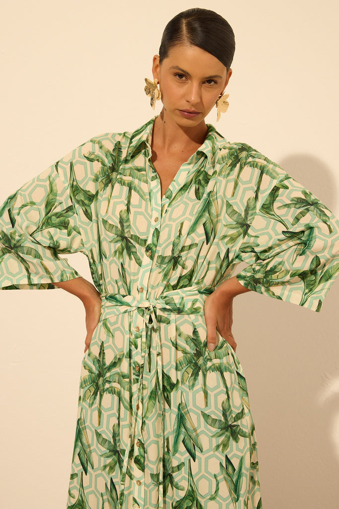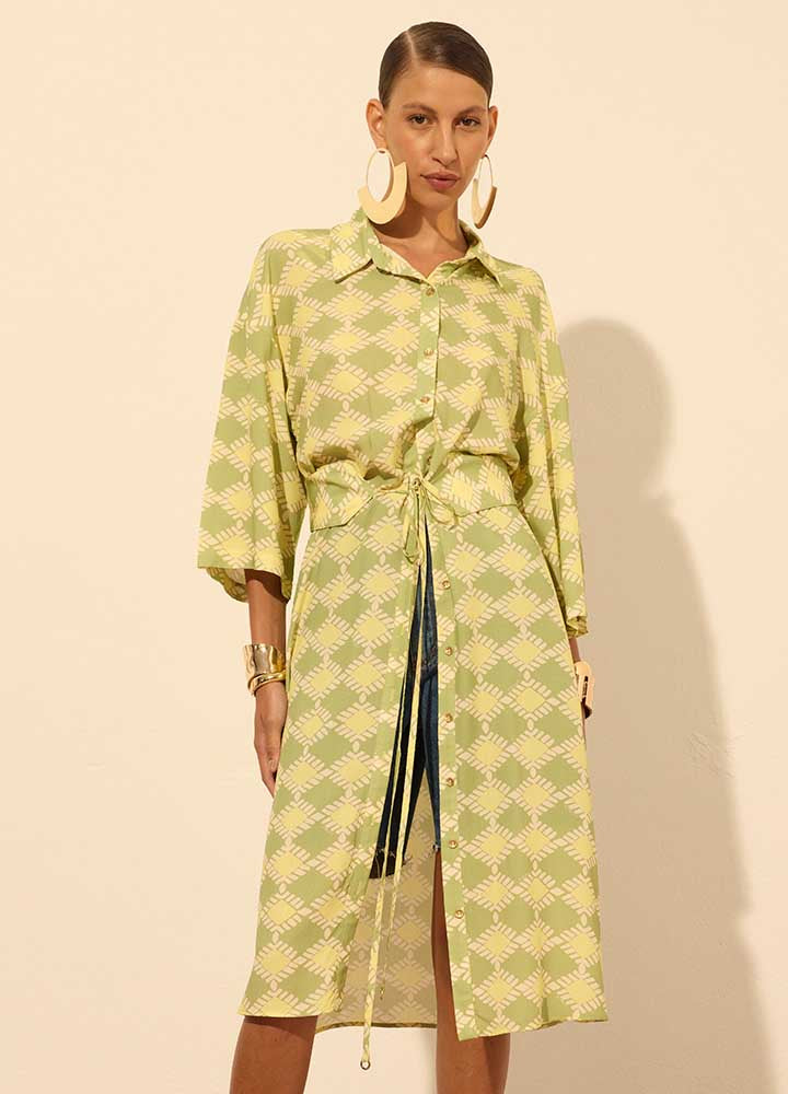 Camisa longa confeccionada em viscose com estampa digital exclusiva. Possui gola colarinho clássica, mangas soltas e abertura frontal com delicados botões dourados. A peça acompanha um cinto diferenciado para amarração na cintura, permitindo destacar a silhueta. Dica de estilo: experimente usá-la como peça única ou como sobreposição com um top básico e calça reta para um look casual chic.