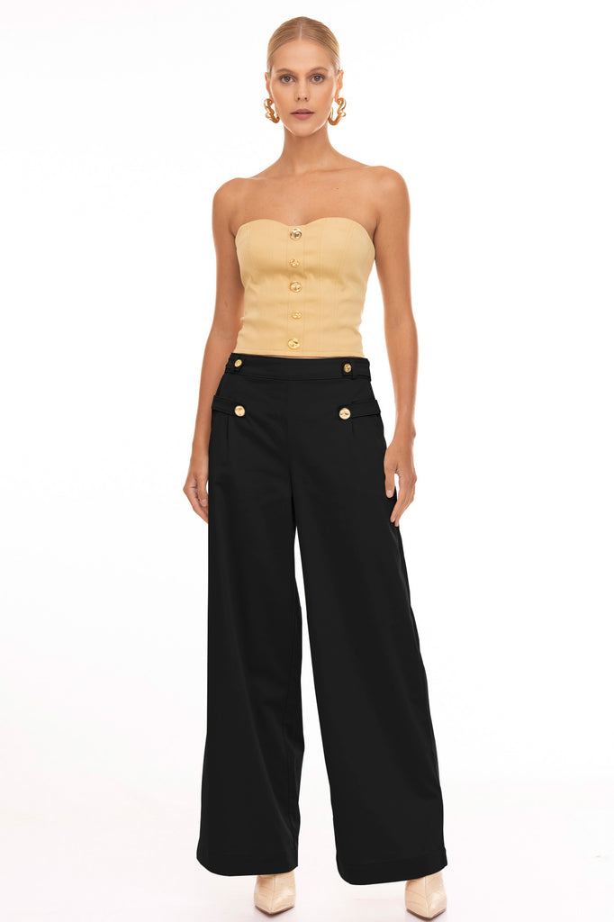 Calça pantalona confeccionada em tecido plano. A peça possui dois bolsos faca funcionais, oferecendo funcionalidade. O fechamento é realizado por um zíper invisível na lateral. Na parte frontal, pregas adicionam volume e movimento, enquanto as pences na parte posterior garantem um ajuste perfeito ao corpo. O destaque fica por conta dos detalhes de aviamentos dourados orgânico, que acrescentam um toque de luxo. Inspirada nas referências da alfaiataria moderna, esta calça combina o clássico e o contemporâneo, resultando em uma peça sofisticada para diversas ocasiões.