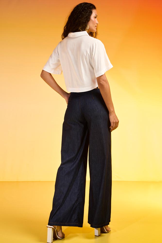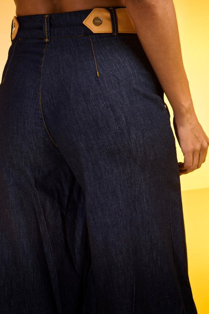 Calça pantalona confeccionada em jeans de lavanderia amaciada, trazendo um estilo atemporal e sofisticado. Possui abertura frontal com zíper de metal, braguilha e botão de pressão. Os dois bolsos funcionais modelo faca e as pences posteriores garantem um ajuste perfeito ao corpo, enquanto os martingales exclusivos em couro ecológico no cós destacam a cintura. Dica de look: Use com uma blusa de seda e sandálias de salto para um visual contemporâneo.