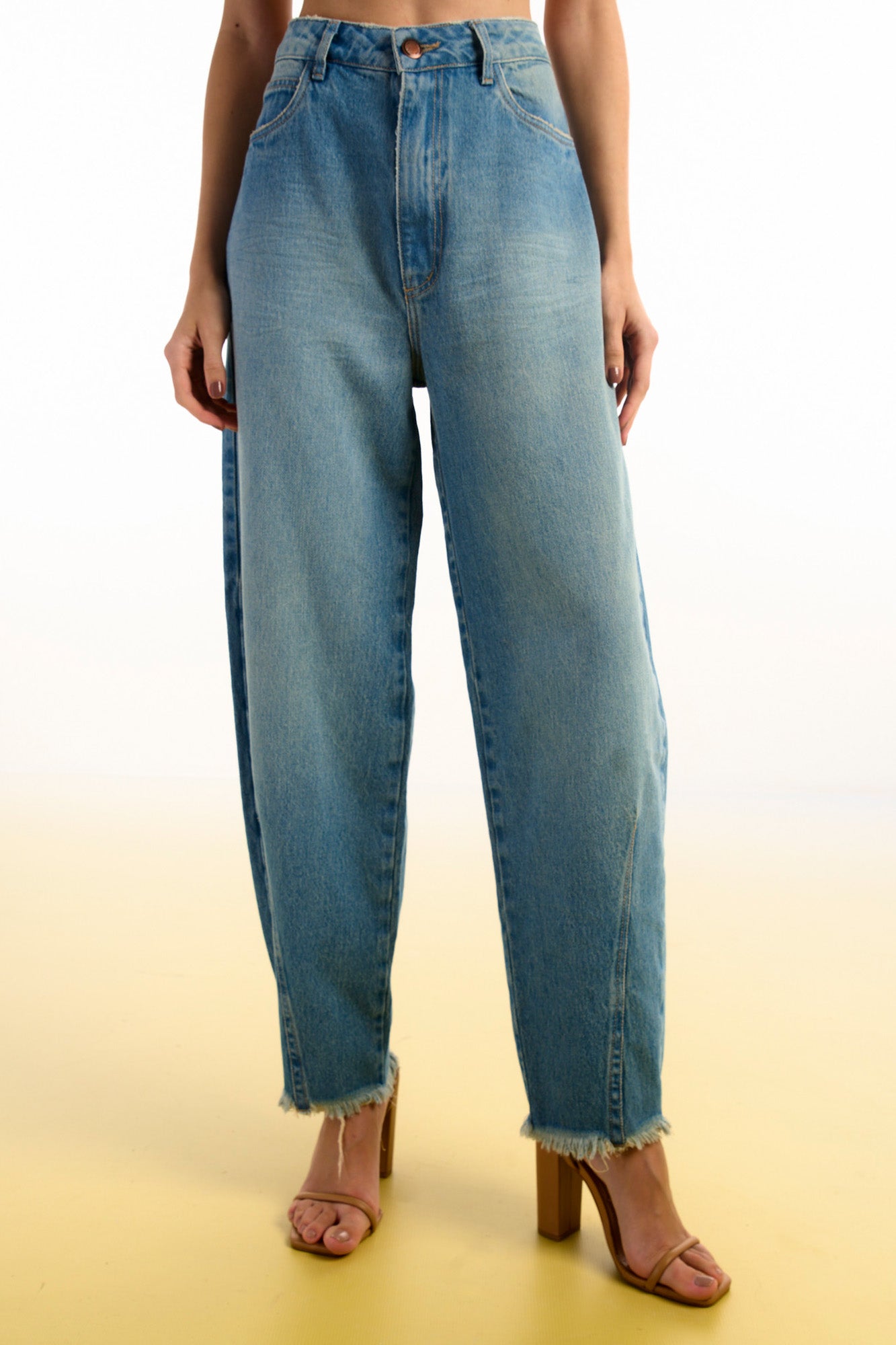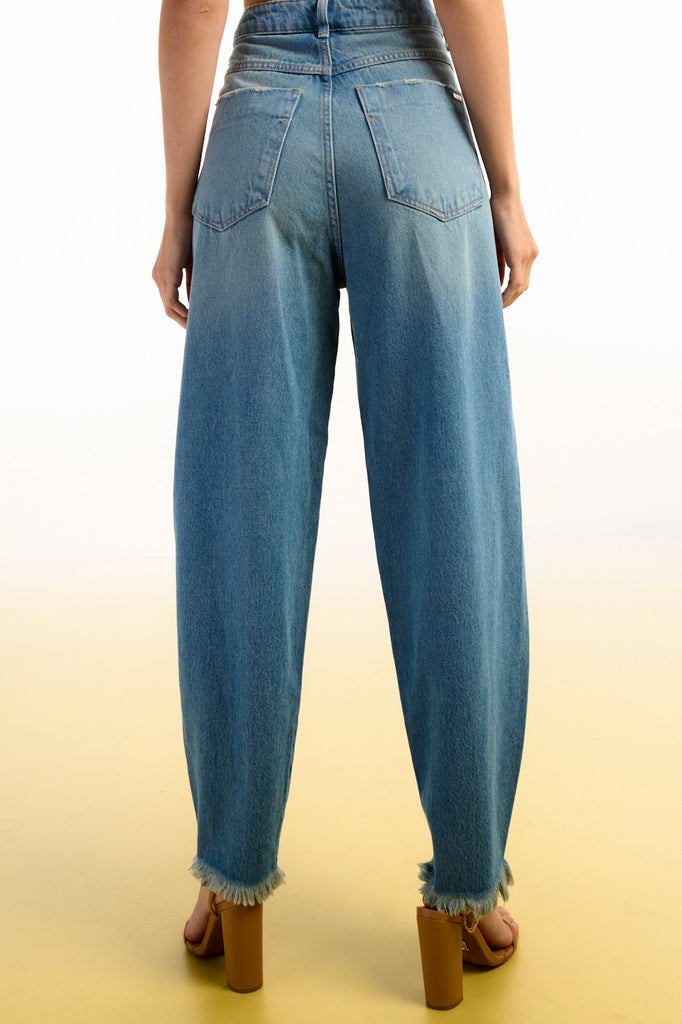 Calça barrel confeccionada em jeans de lavanderia média. A peça possui cós com passantes aplicados, parte posterior com pala e dois bolsos tradicionais, além de três bolsos funcionais na parte frontal. A abertura é feita por botão de metal em cobre e zíper. Destaque para a barra desfiada com pences, que garante um efeito despojado e atual.