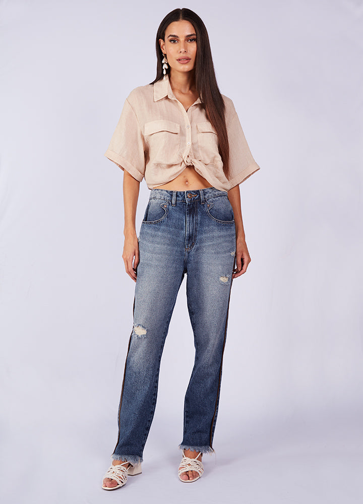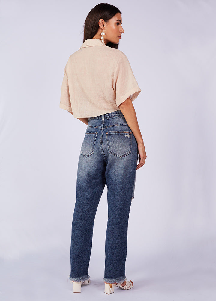 Calça mom de cintura alta confeccionada em jeans de lavanderia escura com puídos. A peça possui dois bolsos funcionais na frente e dois na parte posterior, detalhe de friso de camurça nas laterais da peça, passante diferenciado na parte posterior e barra desfiada. O fechamento é por botão e zíper de metal.