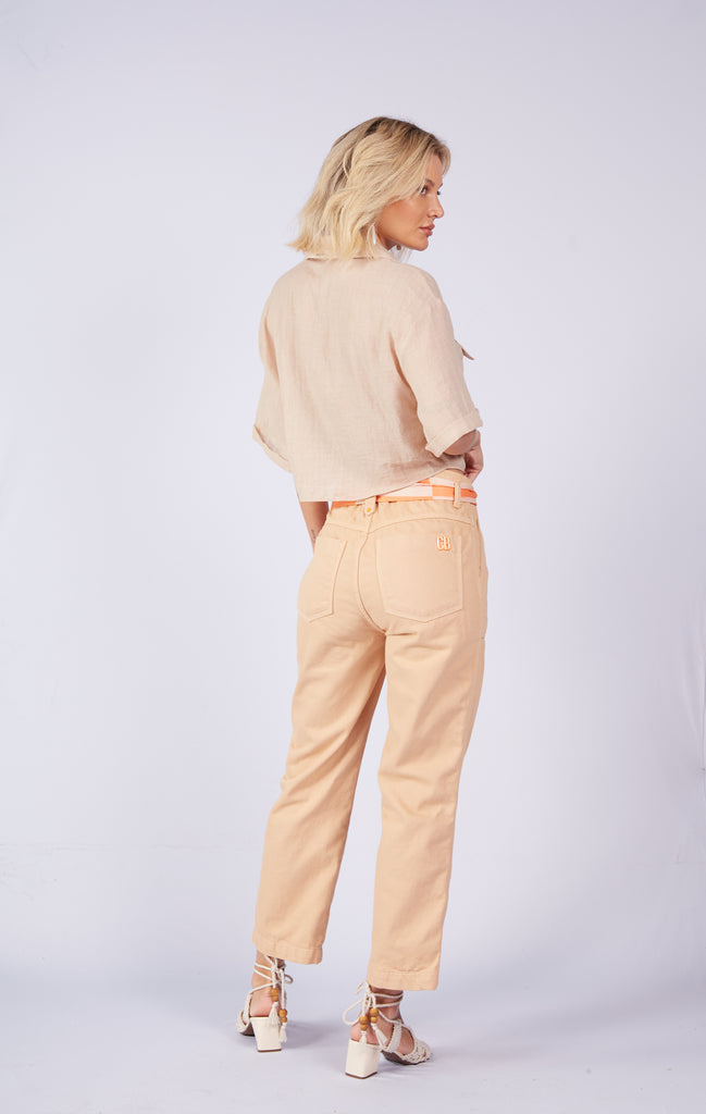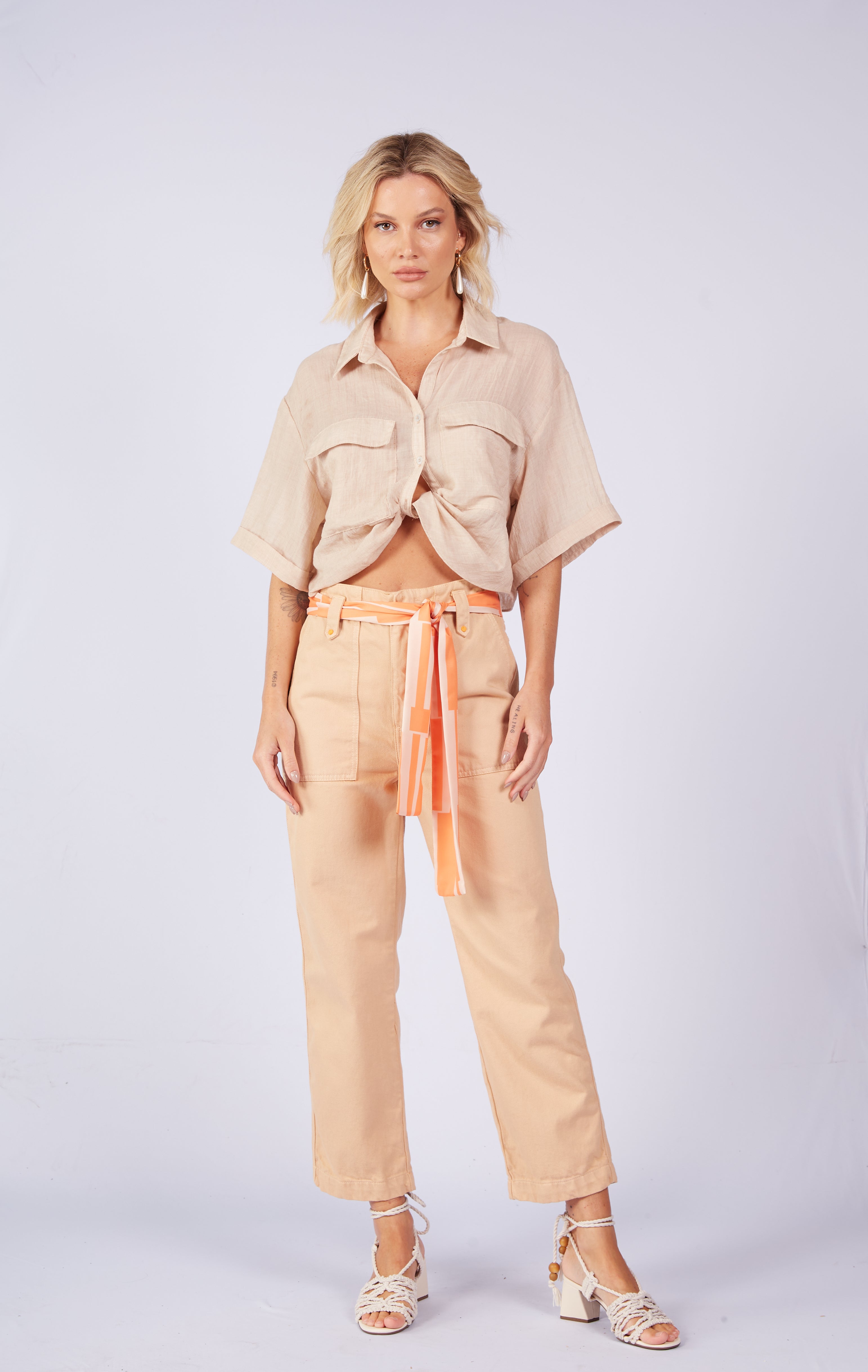 Calça reta de cintura alta confeccionada em jeans color. A peça possui dois bolsos sobrepostos na parte frontal e dois posteriores, cós interno com passantes diferenciados aplicados e acompanhado de cinto de tecido desenvolvido em chiffon estampado. O fechamento é frontal por zíper de metal. Composição: 100%Algodão