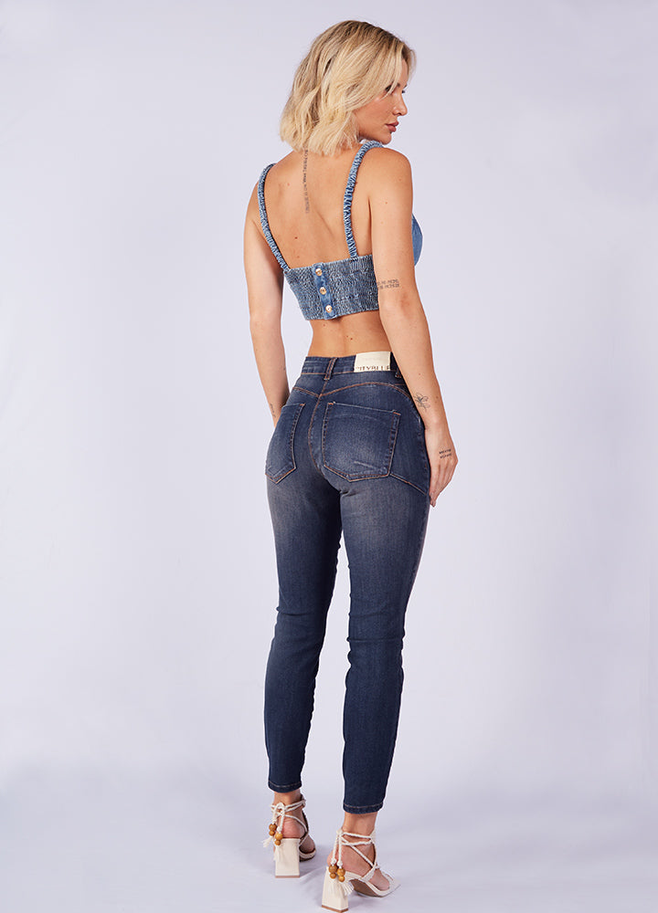 Calça Skinny de cintura baixa confeccionada em jeans de lavanderia escura. A peça possui três bolsos funcionais frontais e dois posteriores, cós com passantes aplicados e detalhes de pences na parte posterior . O fechamento é por botão e zíper de metal e a barra com acabamento simples.