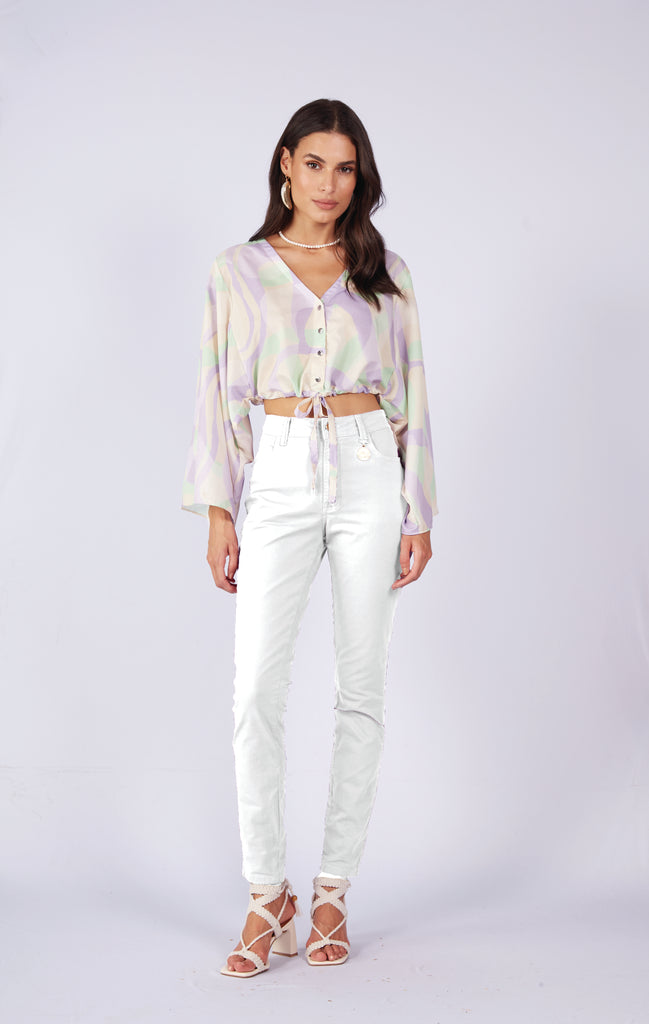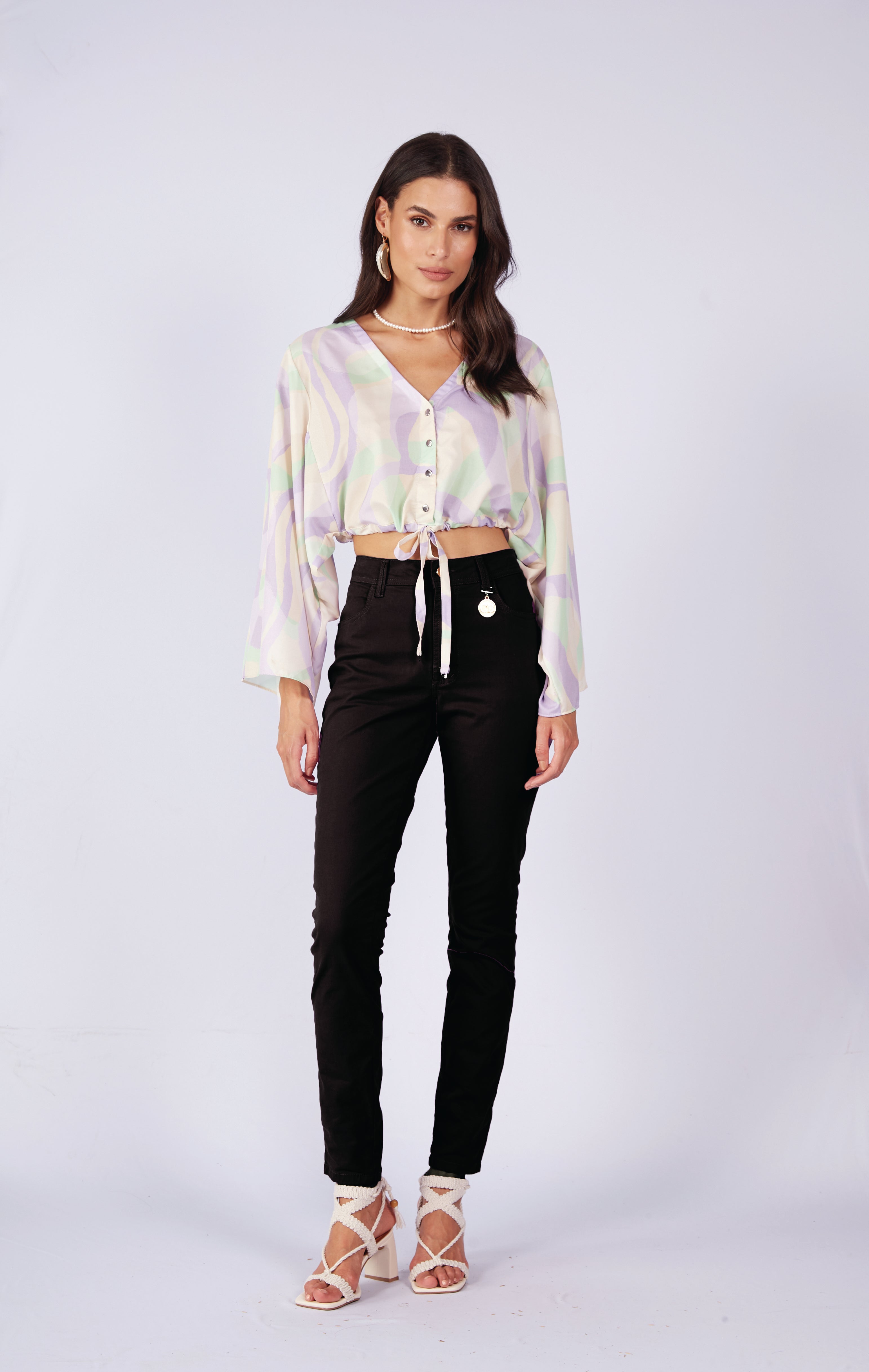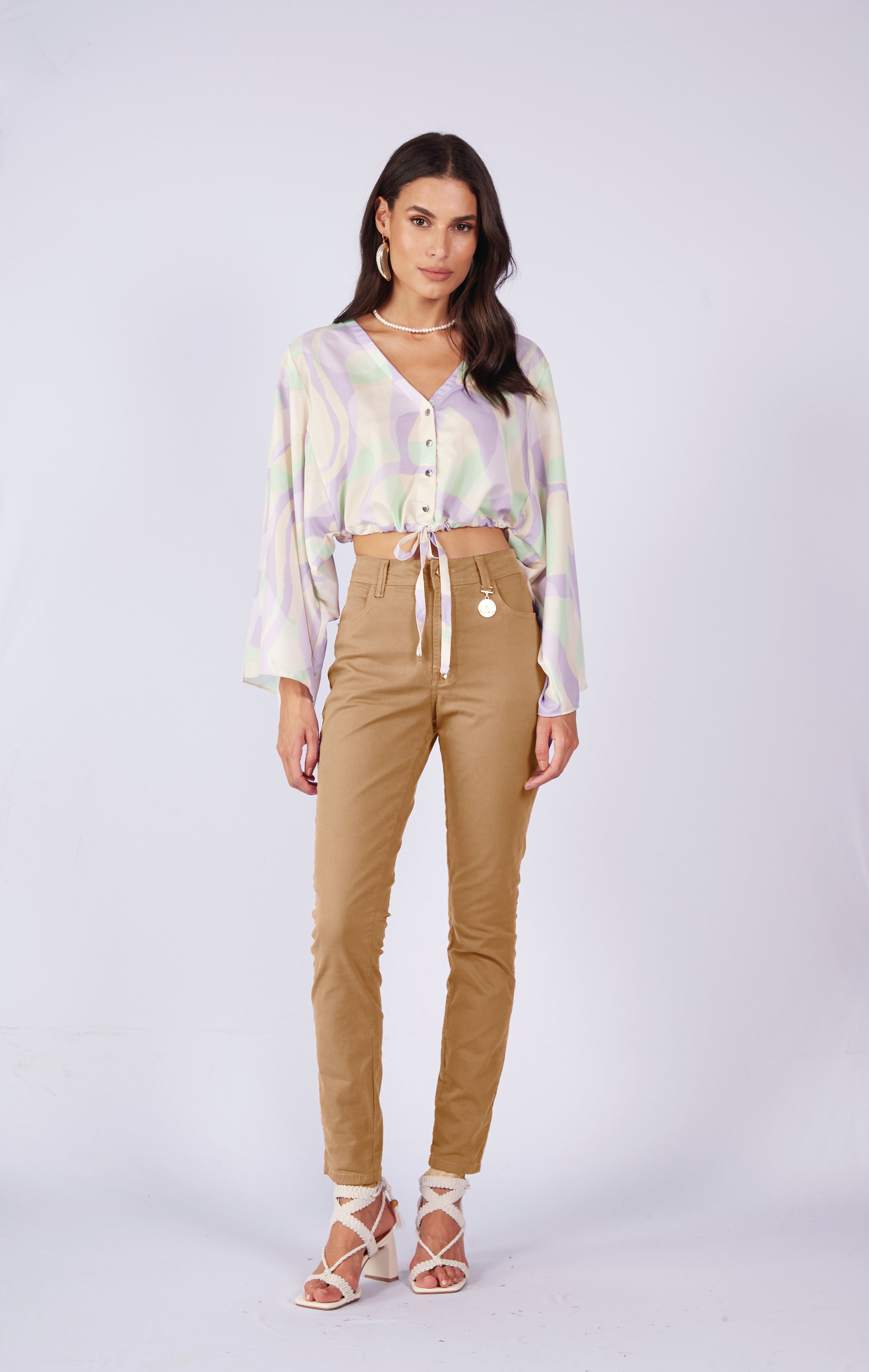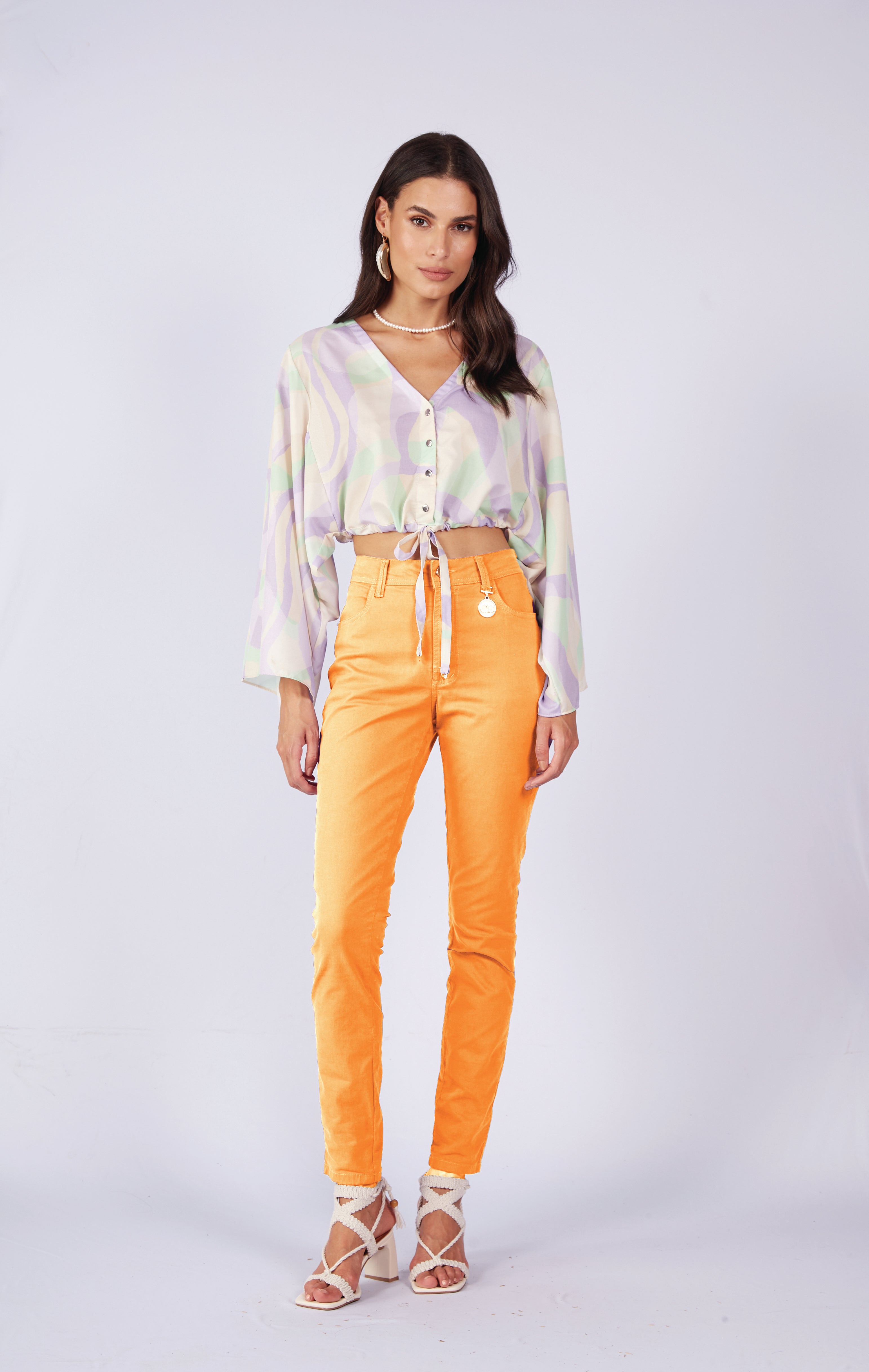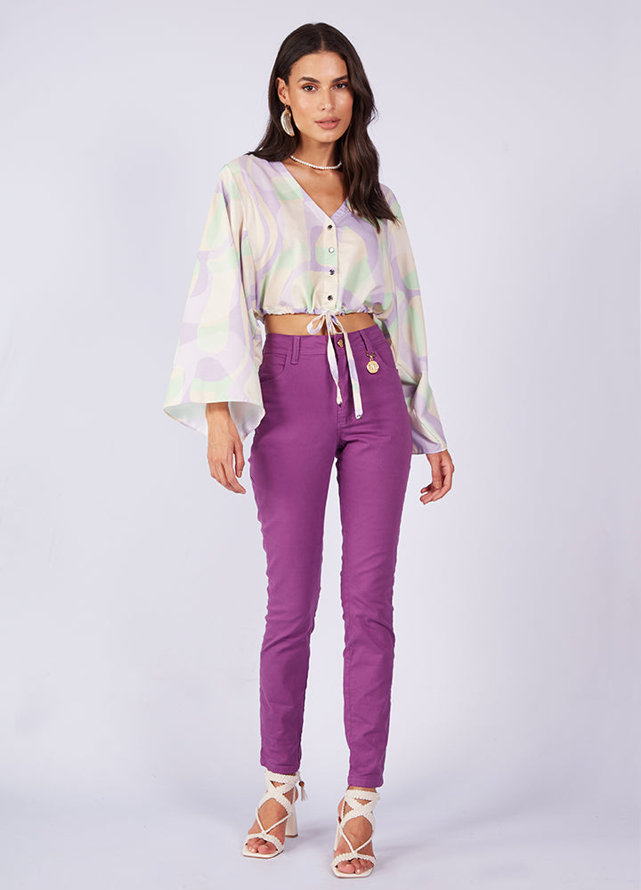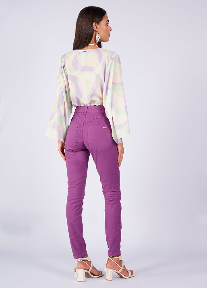 Calça skinny de cintura média confeccionada em jeans color. A peça possui dois bolsos funcionais na parte frontal e dois posteriores, cós com passantes aplicados, detalhe de pences na parte posterior, pala modelo coração e barra com acabento simples. O fechamento é por botão e zíper de metal. 97,5%Algodão 2,5%Elastano