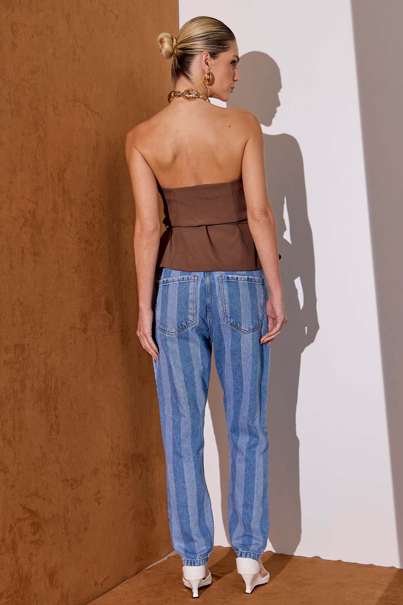 *CALÇA MOM JEANS LISTRADO CÓS ALTO