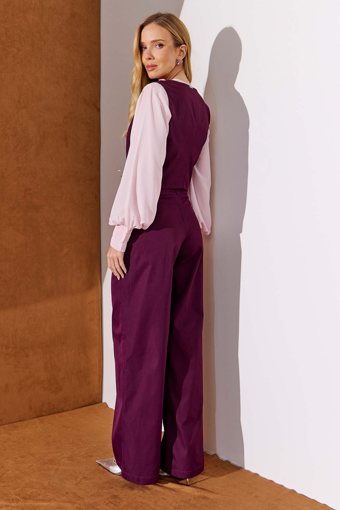 Calça wide leg de alfaiataria, confeccionada em tecido plano. Possui modelagem reta com caimento soltinho. O modelo conta com bolsos frontais funcionais tipo faca, fechamento posterior por zíper invisível e barra com acabamento tradicional. O destaque fica por conta dos detalhes com botões em pedraria, que adicionam um toque luxuoso à peça. 100% POLIESTER.