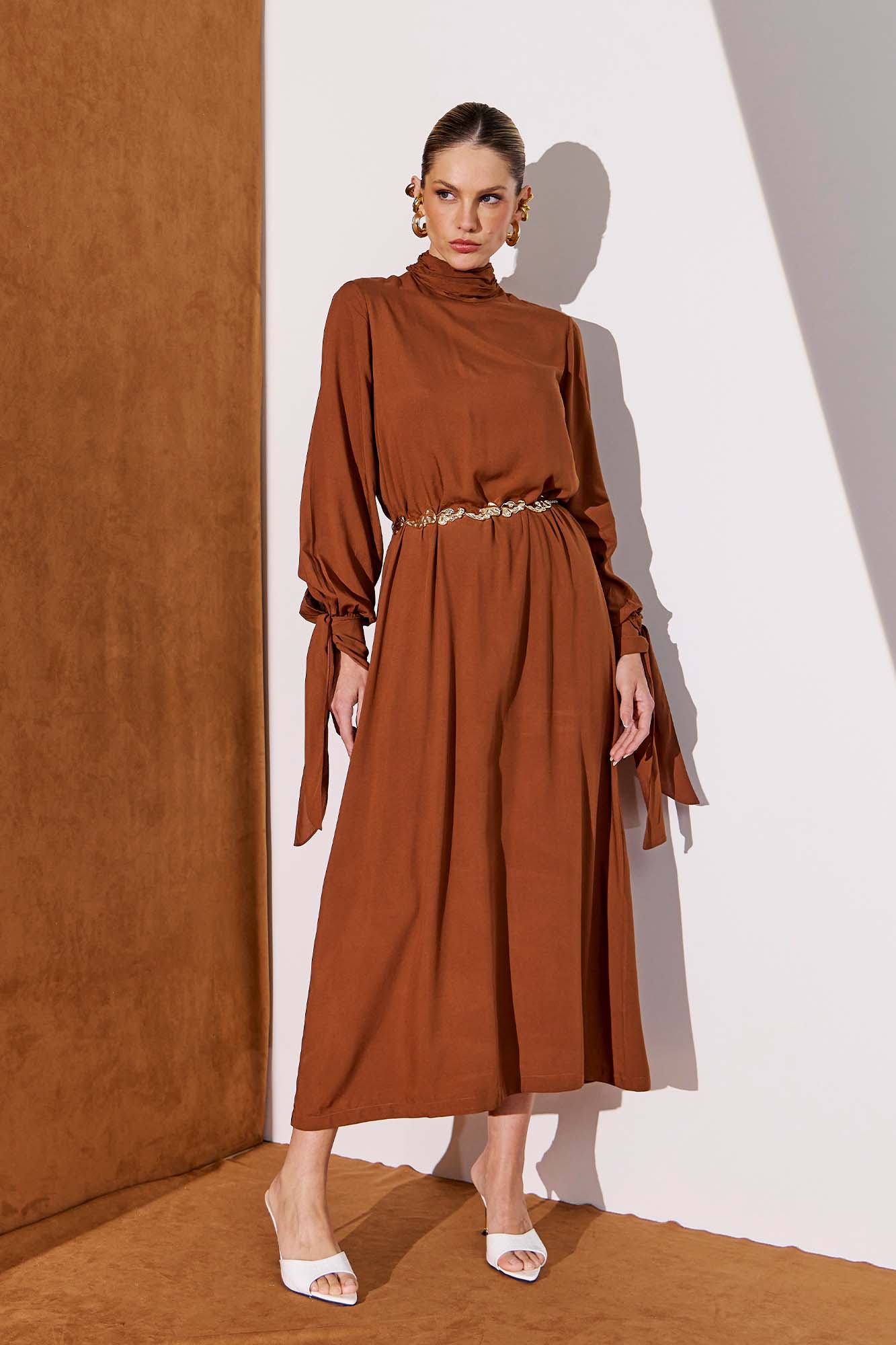 Vestido super midi e fluido confeccionado em tecido plano, com gola alta, punhos com abertura e botões dourados delicados, além de zíper invisível nas costas. Destaque para as faixas embutidas para amarração posterior, que criam movimento e elegância ao look. 100% VISCOSE.