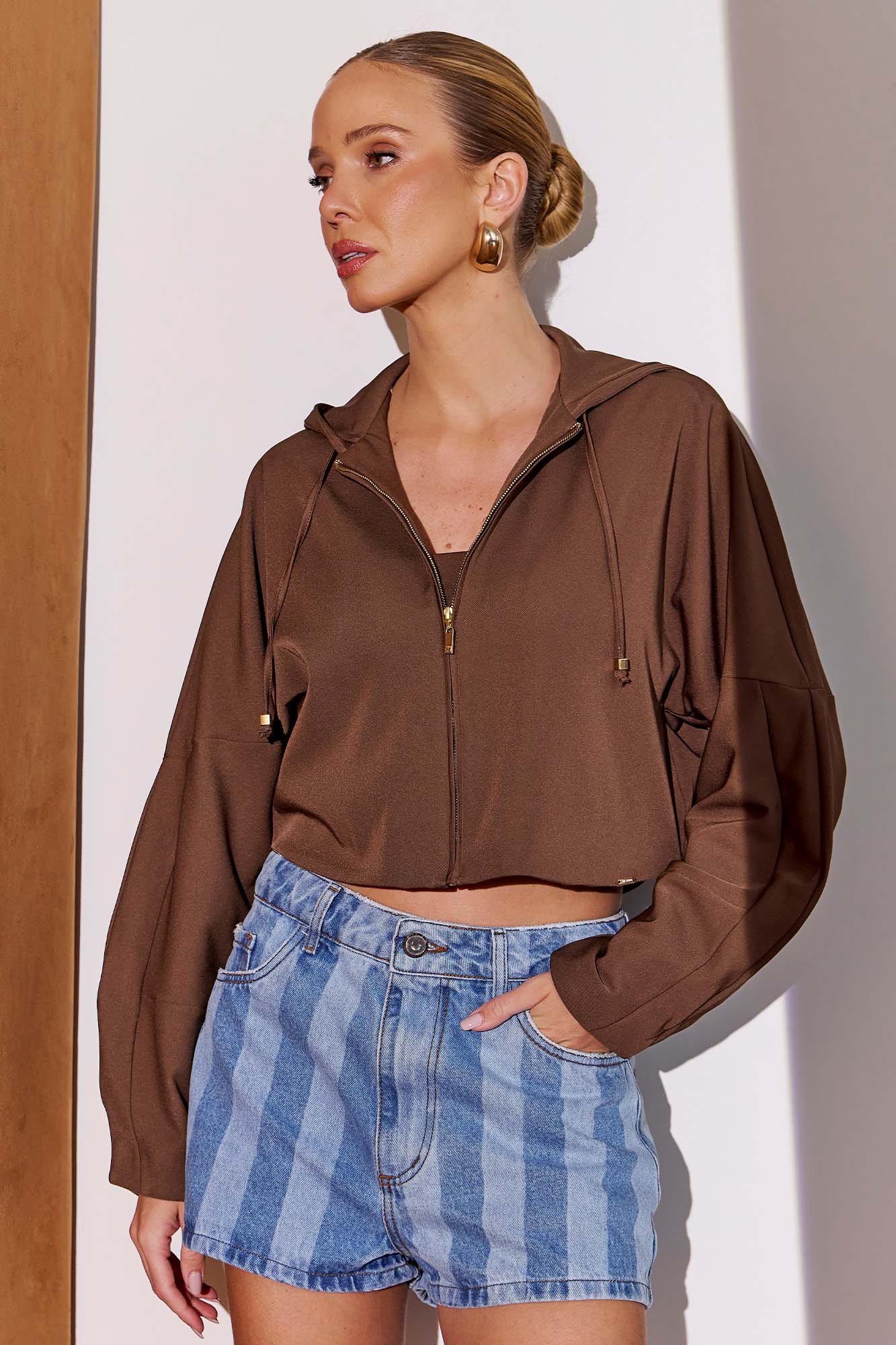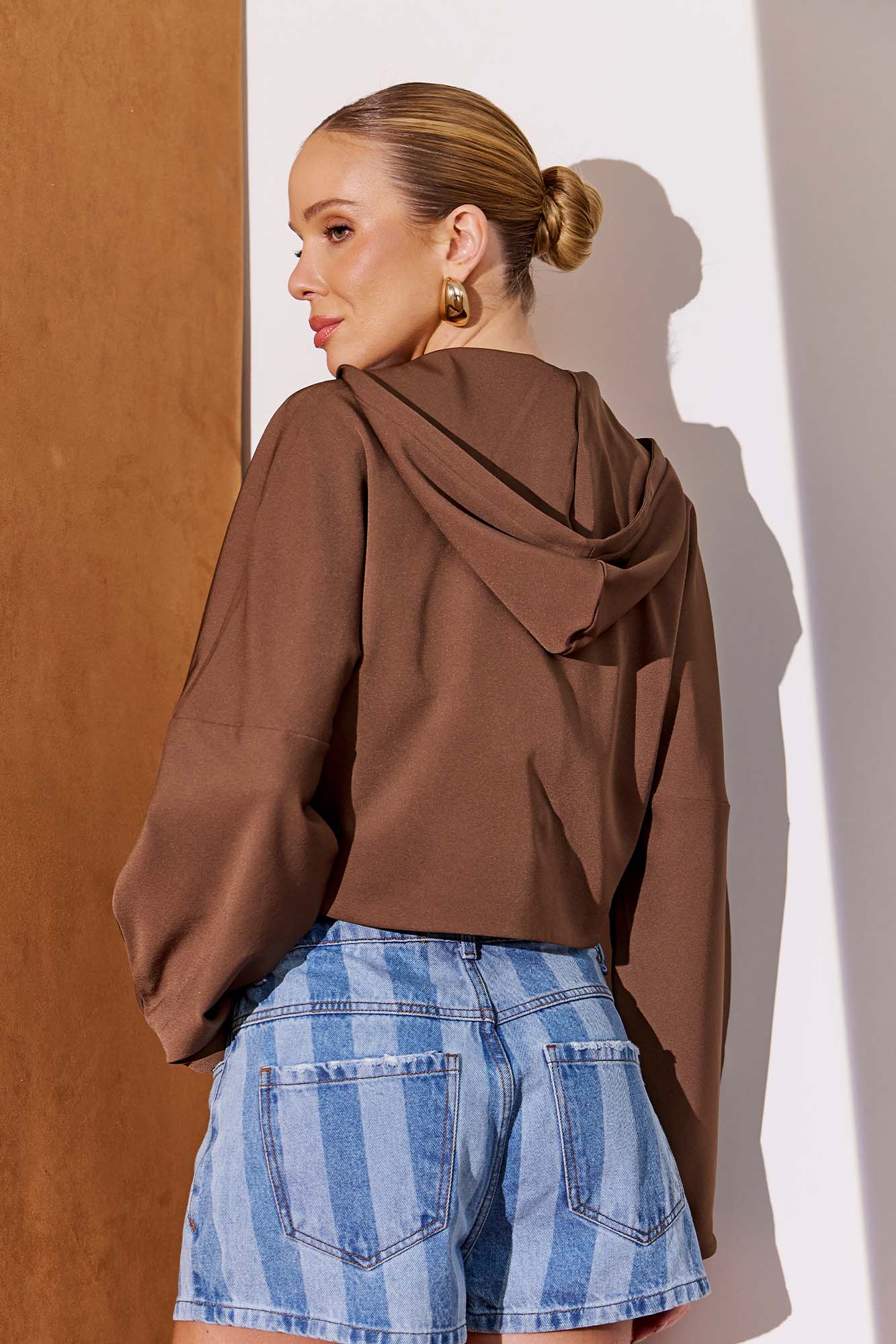 Casaqueto confeccionado em tecido plano, com forro interno que proporciona mais conforto. Possui abertura frontal com zíper de metal dourado e design esportivo com capuz. Os recortes nas mangas adicionam um toque moderno. Dica de look: use com calça jogger ou jeans para um visual despojado, perfeito para o dia a dia. 95% POLIESTER 5% ELASTANO.