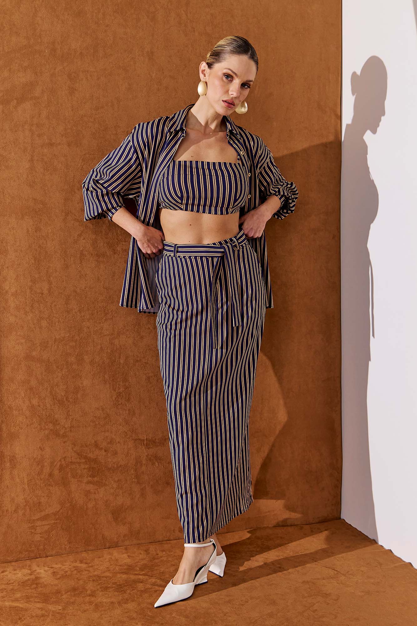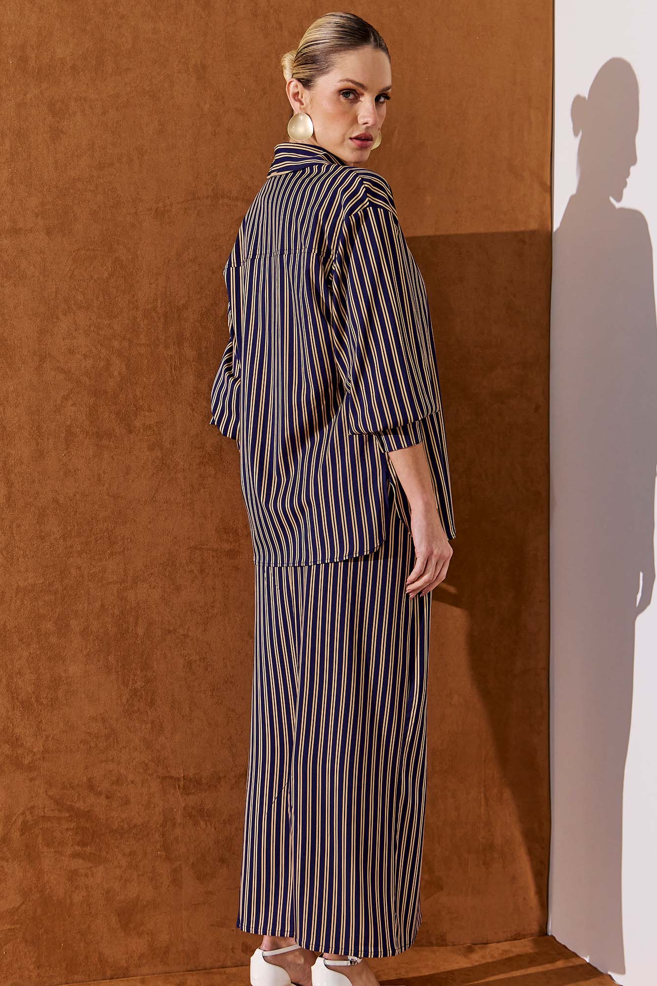Saia longa confeccionada em tecido plano listrado. Com modelagem clássica de alfaiataria, a peça traz sofisticação ao visual com braguilha frontal, cós com passantes e bolsos funcionais que adicionam um toque utilitário. As pences e a fenda posterior garantem caimento impecável e liberdade de movimento. O cinto de amarração no mesmo tecido realça a cintura. Dica: Combine com regata neutra e a camisa de sobreposição, conjunto no mesmo material da saia, para um look fashionista e moderno. 97% VISCOSE 3% ELASTANO.