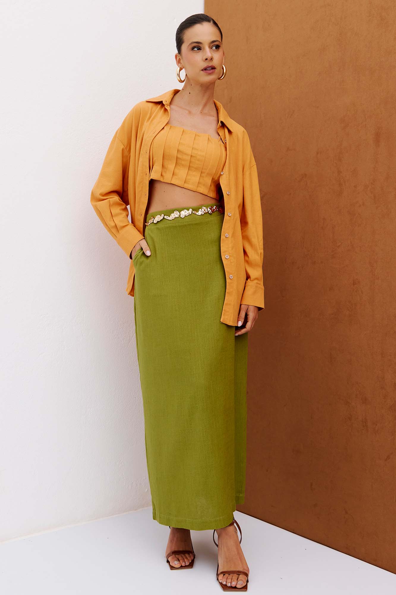 Saia reta super midi confeccionada em tecido plano com aspecto de linho color, possui modelagem atemporal e visual clean. Conta com abertura lateral por zíper invisível, fenda posterior que garante mobilidade e forro com elastano para mais conforto. 80% VISCOSE 20% LINHO.