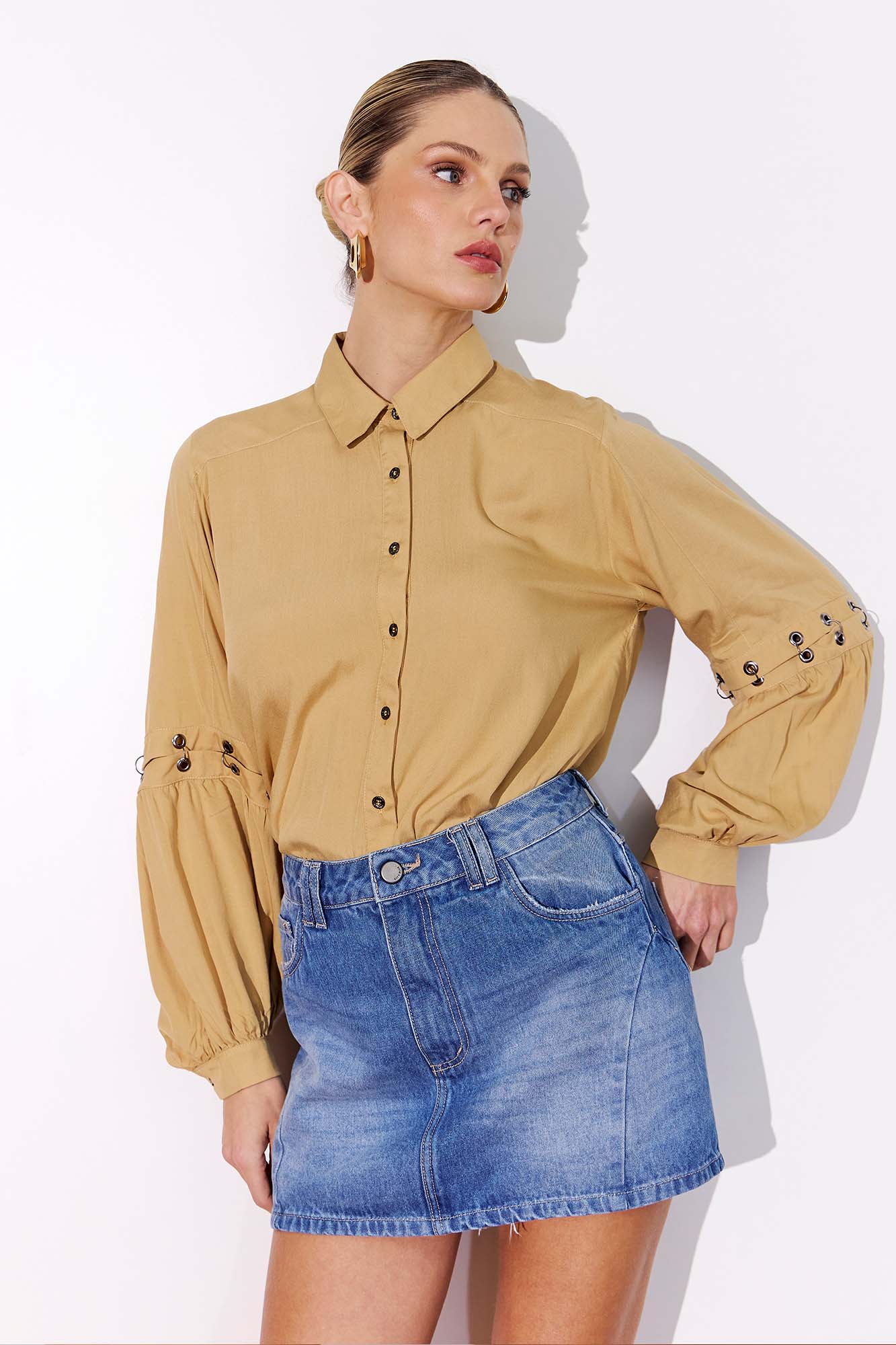 Short saia confeccionada em jeans de lavanderia média. Com cós de passantes duplos, bolsos funcionais e bolso relógio, a peça tem fechamento por zíper e botão de metal com aviamentos em tom ônix. Os recortes estratégicos adicionam um toque moderno ao visual. Combine com camiseta oversized e tênis chunky para um look urbano cheio de atitude. 100% ALGODÃO.