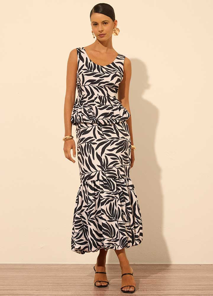 Saia super midi confeccionada em malha com elastano. A peça conta com um elegante babado balonê na barra, conferindo volume e movimento. Possui pences estratégicas para um ajuste mais preciso ao corpo, garantindo uma silhueta sofisticada. O forro interno oferece maior conforto, enquanto a abertura discreta é feita por um zíper invisível na lateral, mantendo a estética clean e refinada do design.