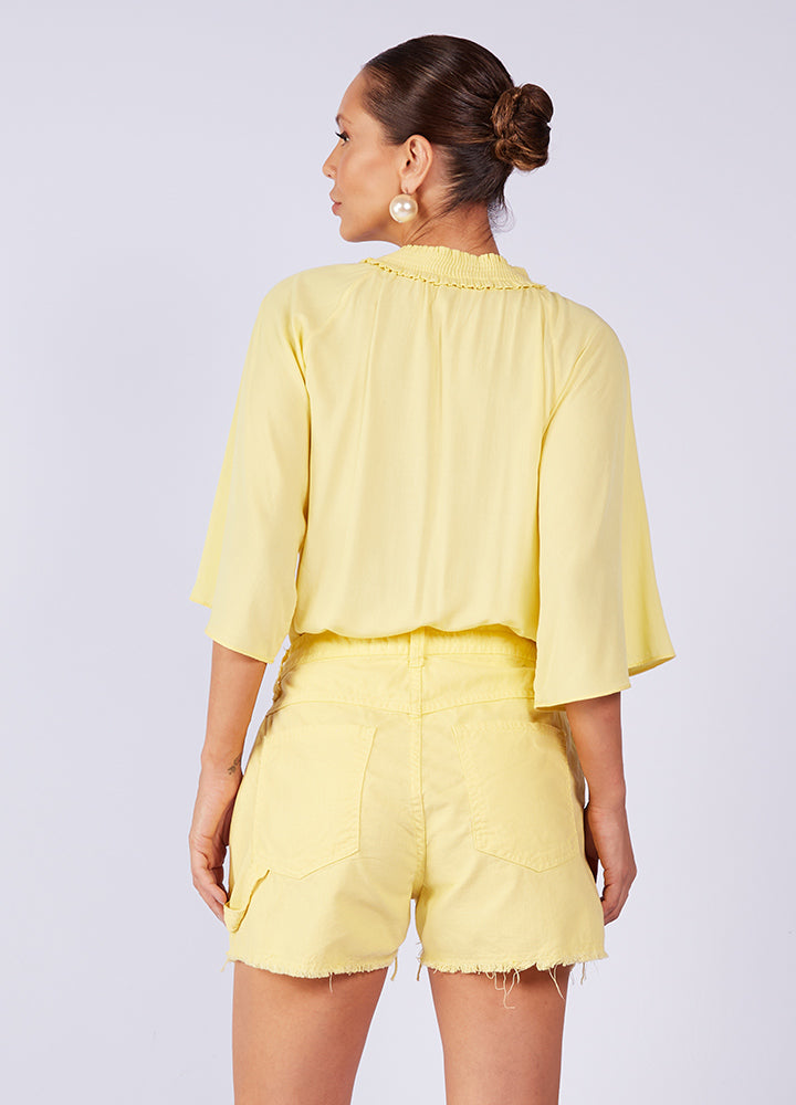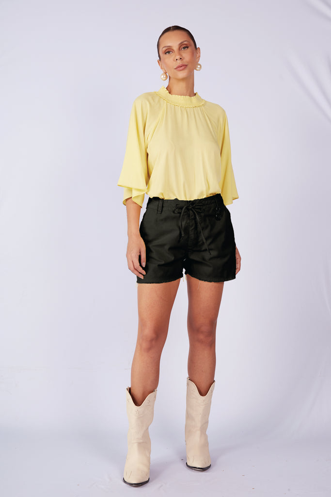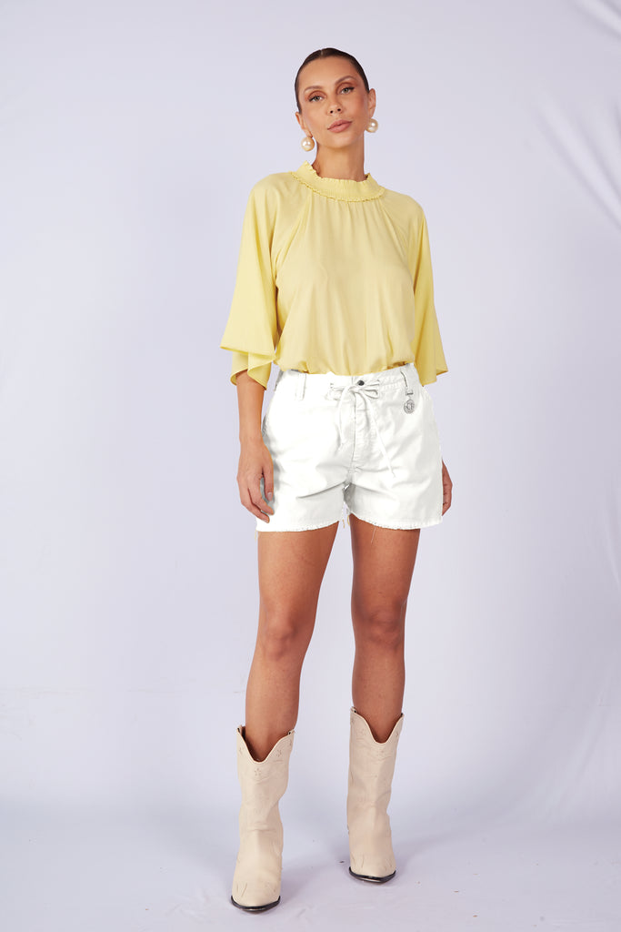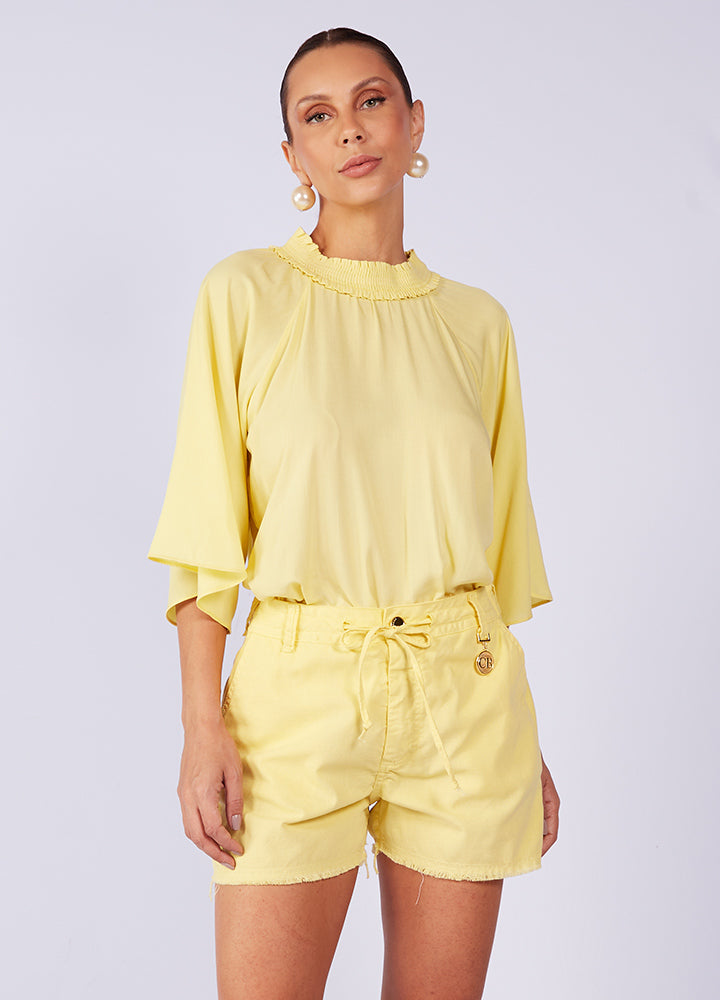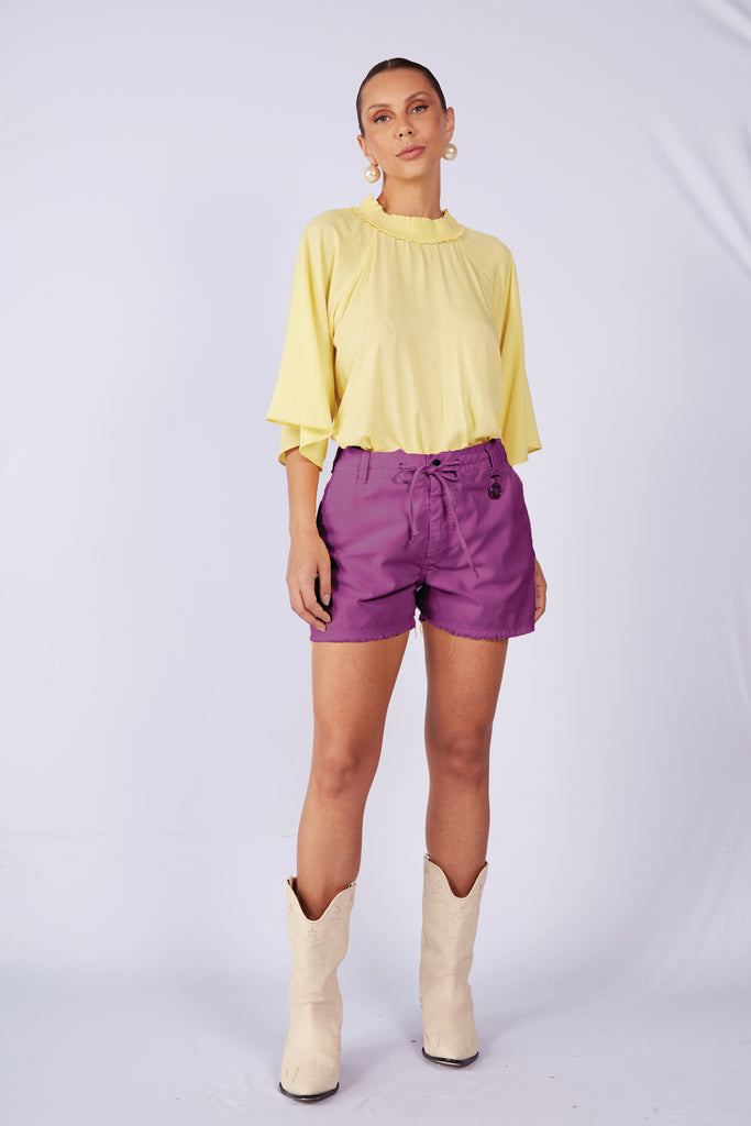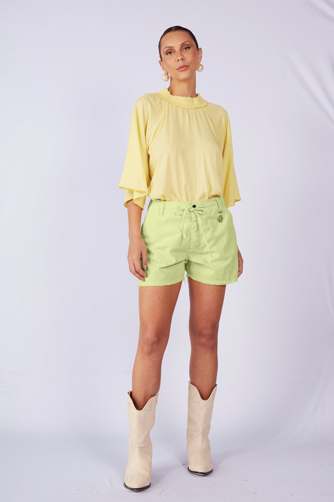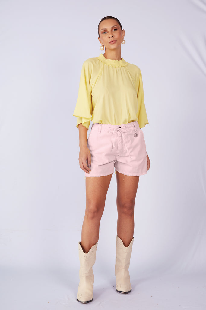 Short de cintura média confeccionado em jeans color. O modelo possui dois bolsos funcionais na frente e dois na parte posterior, cós com caminho para passar tira com amarração frontal, passantes, pala posterior e barra desfiada. O fechamento é por botão e zíper de metal.