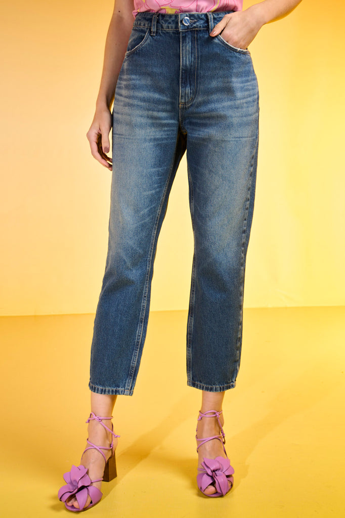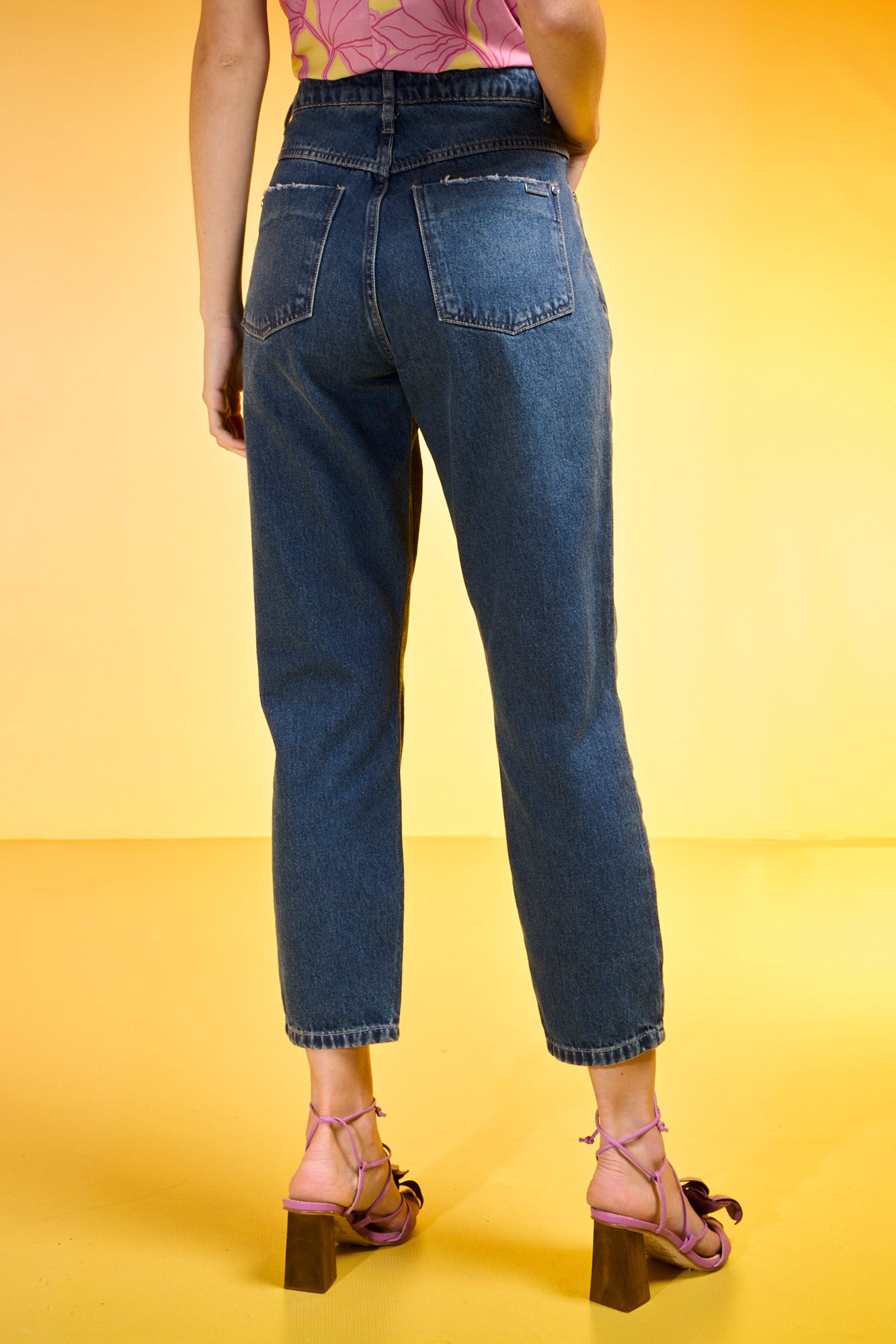 Calça mom confeccionada em jeans. A peça possui cós super alto com passantes, dois bolsos funcionais na parte frontal e dois na parte posterior. A abertura é frontal, com botão e zíper de metal, e os aviamentos são em tom azul. Destacam-se os detalhes puídos nos bolsos e nas linhas em tons contrastantes, que acrescentam estilo e autenticidade.