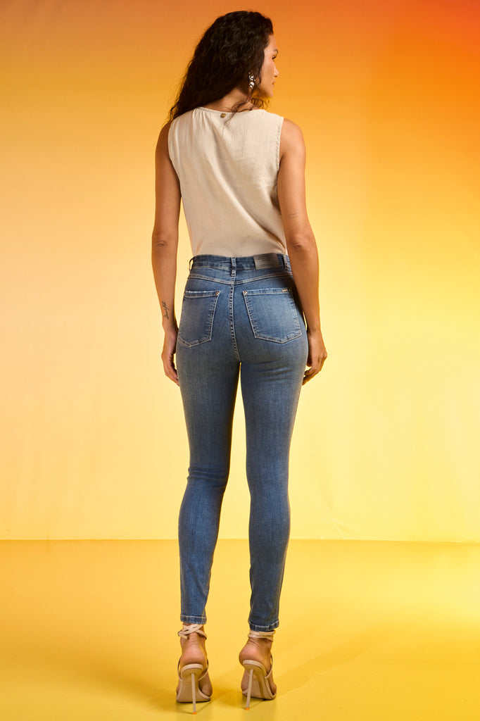 Calça skinny de cós alto em jeans de lavanderia média, com dois bolsos funcionais na frente e dois atrás. Os aviamentos e as aplicações em metais com tom níquel garantem um toque exclusivo e autêntico. Essa calça pertence à linha Power Move, uma inovação da City Blue que proporciona jeans com tecnologia de alta elasticidade em sua composição, garantindo máximo conforto e liberdade de movimento durante o uso! 97% ALGODÃO 3% ELASTANO.
