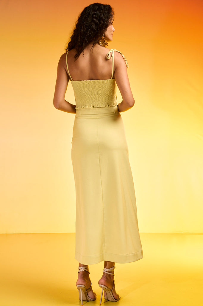 Saia longa confeccionada em tecido plano. Possui cós largo com passantes aplicados e cinto com amarração, que permite destacar a cintura, todo pespontado. Conta com abertura lateral por zíper invisível, barra larga e uma fenda frontal que acrescenta uma sensualidade sutil.