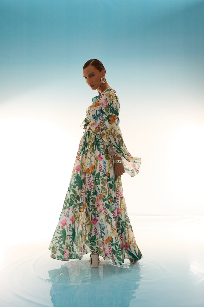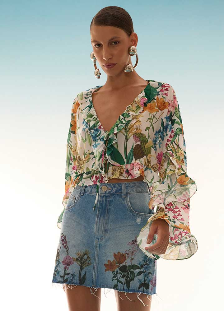 Blusa confeccionada em tecido plano estampado. Possui babados franzidos embutidos ao redor do decote, nas barras e nas mangas, adicionando charme à peça. A modelagem solta e as mangas com aberturas trazem conforto e leveza, enquanto a dupla amarração frontal oferece um toque delicado. Dica de estilo: combine com jeans de cintura alta ou com a saia longa babados da coleção City Blue para um visual total boho chic.
