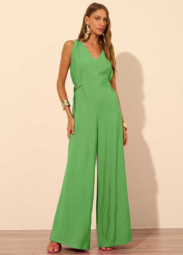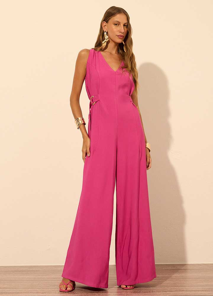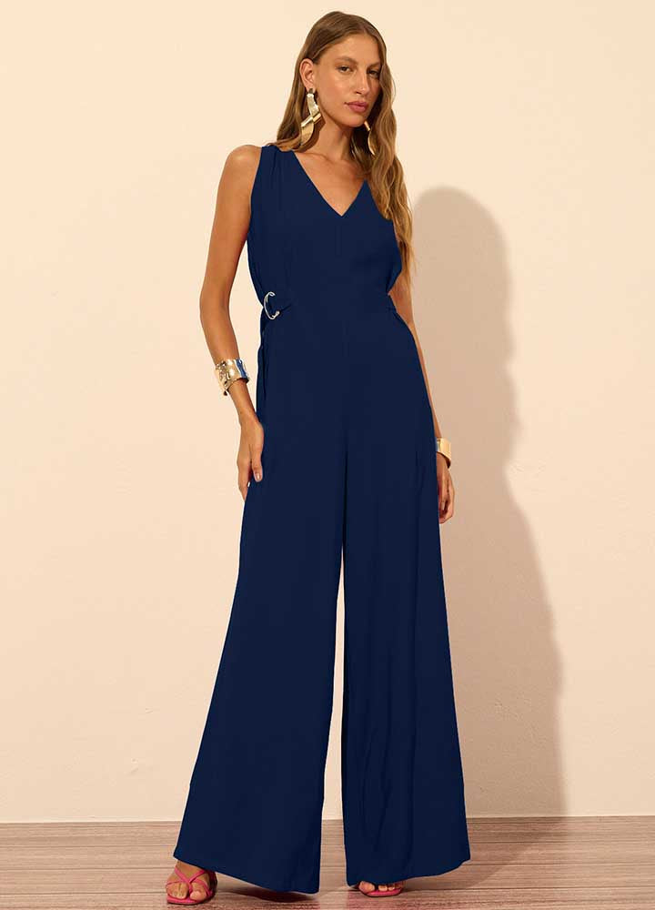 Macacão confeccionado em tecido plano. O modelo apresenta um decote elegante em V, que adiciona um toque sofisticado ao visual. Os detalhes de fivelas nas laterais, embutidos nos recortes, não só proporcionam um ajuste perfeito ao corpo, como também desenham a silhueta feminina de forma harmônica. A modelagem pantalona ampla oferece conforto e alonga, garantindo produções autênticas e estilizadas.