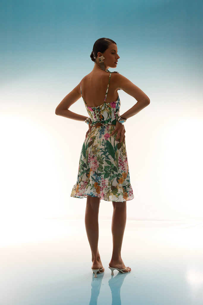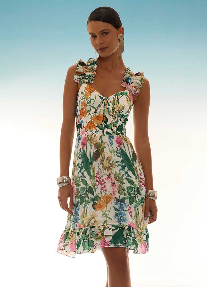 Vestido curto confeccionado em tecido plano com estampa exclusiva City Blue e forro de crepe, pensado para mulheres que valorizam detalhes únicos. A peça apresenta alças ajustáveis com reguladores e frente dupla com recortes que realçam o busto. O destaque vai para os ombros e a saia plissados e franzidos, que adicionam um toque romântico. As costas ficam sutilmente à mostra com um charmoso cordão trançado, enquanto o zíper invisível garante praticidade. Combine com sandálias de salto delicadas e acessórios minimalistas para um look encantador.