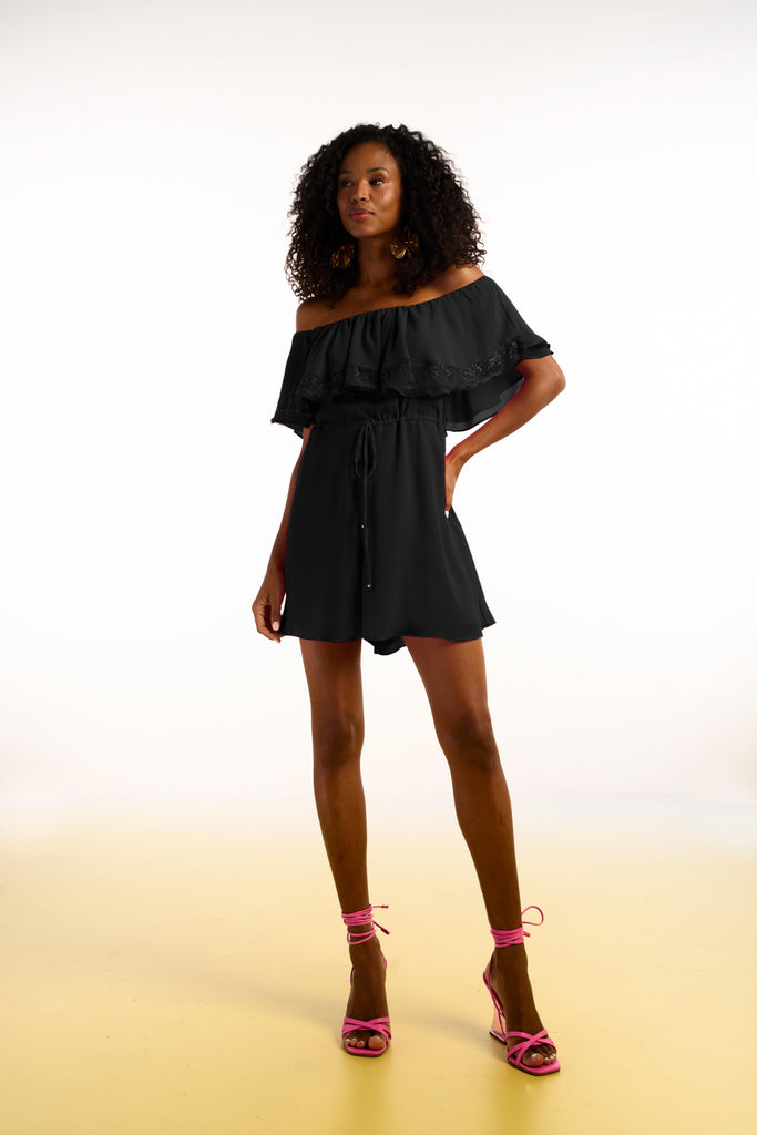 Macaquinho confeccionado em tecido plano com forro. Com decote ombro a ombro e babados delicados, este modelo traz aplicações de renda tingida na cor da peça, adicionando charme e sofisticação. A cintura é ajustada por cordões de amarração frontal e elástico nas costas, garantindo um ajuste perfeito. Dica: Complete o visual com uma bolsa crossbody para um toque casual e moderno.