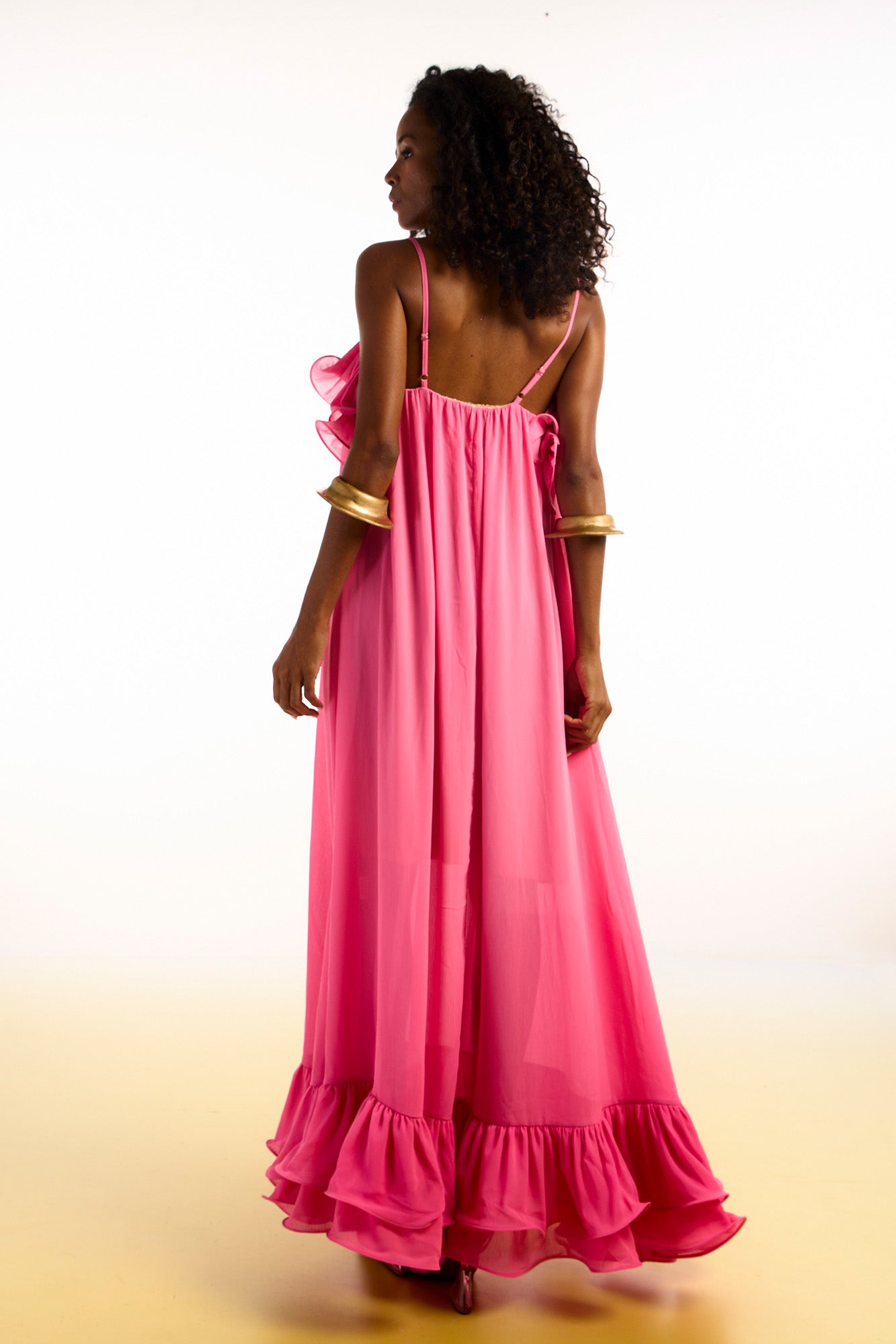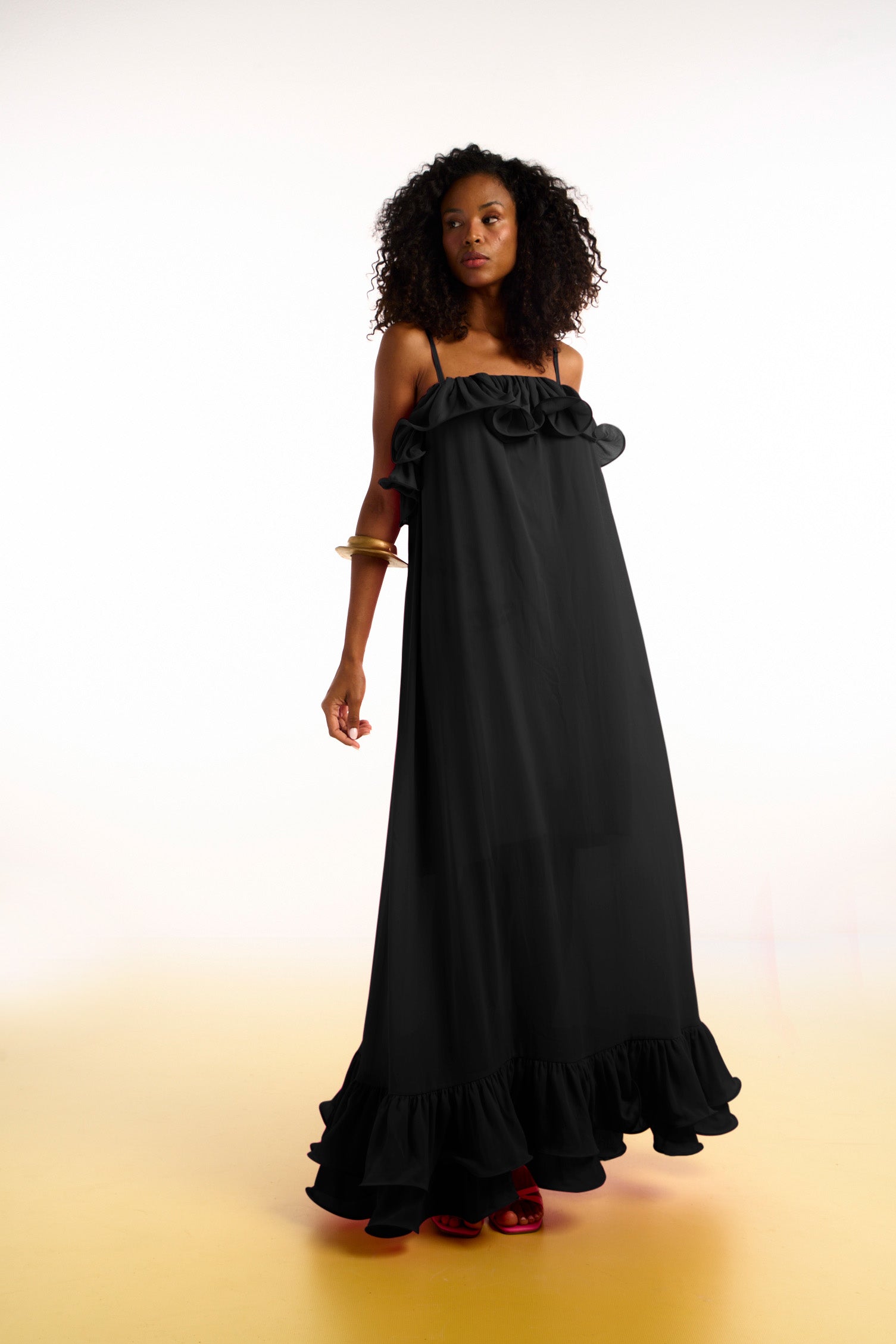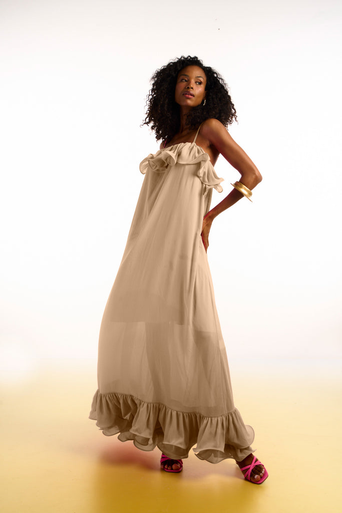 Vestido longo confeccionado em tecido plano com leve textura. A peça conta com alças ajustáveis por reguladores, elástico no decote e forro interno para maior conforto. Com design luxuoso, o vestido apresenta decote e barras com babados embutidos, volumosos e franzidos, criando uma peça dramática e contemporânea, ideal para eventos especiais.
