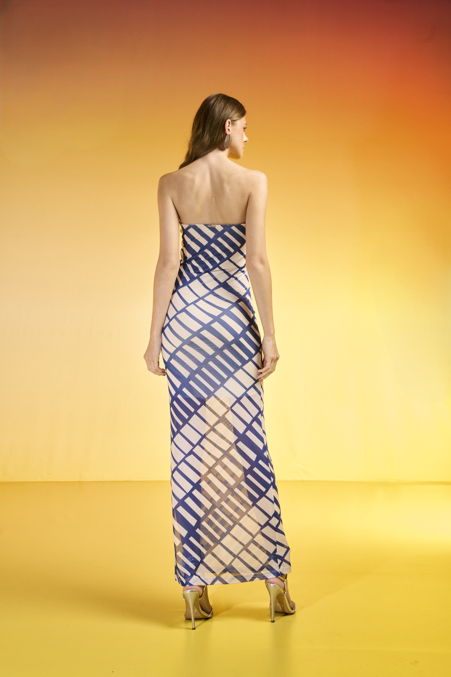 Vestido strapless confeccionado em tule e forro com elastano. Possui fenda lateral para maior liberdade de movimento e decote com elástico para mais segurança. Com estampa exclusiva City Blue, é a escolha ideal para quem deseja um look que alia estilo e conforto.