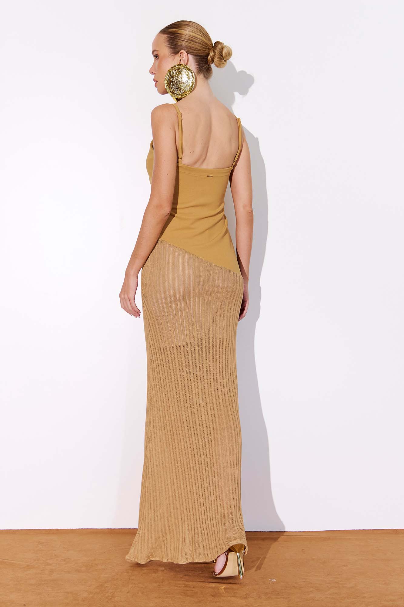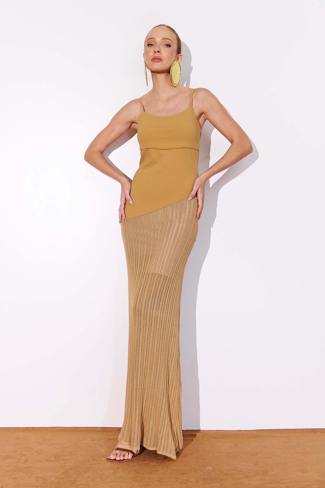 Vestido longo confeccionado em tecido plano, com recorte em malha tricot diferenciada, uma inovação da malharia que traz textura e uma estética artesanal, combinando o clássico ao contemporâneo. A peça conta com forro para maior conforto e uma discreta abertura lateral com zíper invisível. As alças são ajustáveis por meio de reguladores. Dica: combine com acessórios dourados de design orgânico para um look marcante! MALHA FIT CREPE: 96% POLIESTER 4% ELASTANO. MALHA LECCE: 100% VISCOSE.