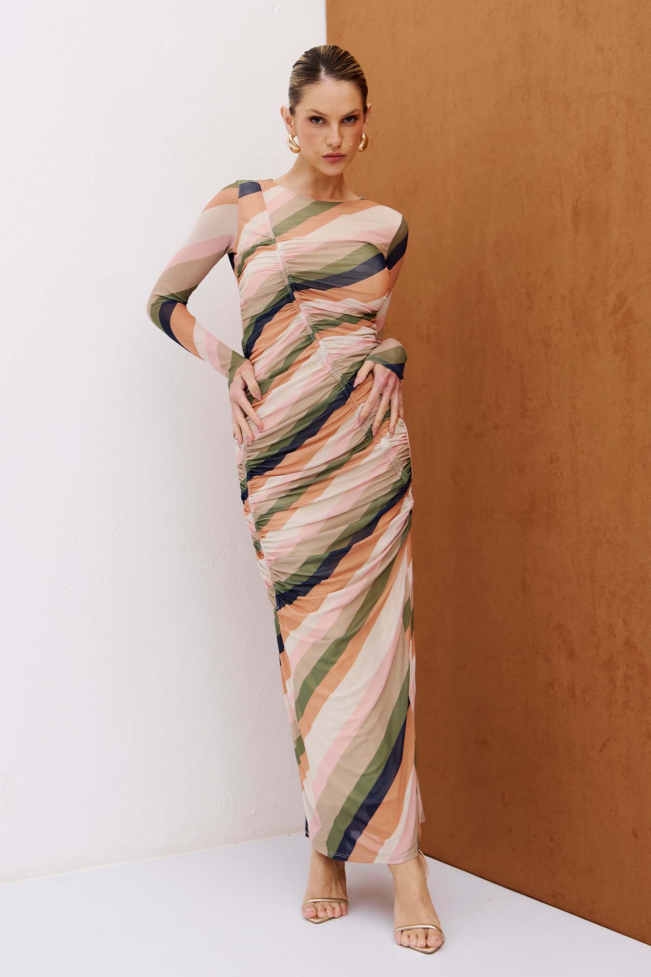 Vestido super midi confeccionado em malha tule e forro com elastano. A frente é toda drapeada com elástico, o que valoriza as curvas e traz conforto. Possui zíper invisível nas costas para um caimento perfeito e fácil de vestir. Dica: Combine com salto e acessórios para um look moderno e elegante. 96% POLIESTER 45 ELASTANO.