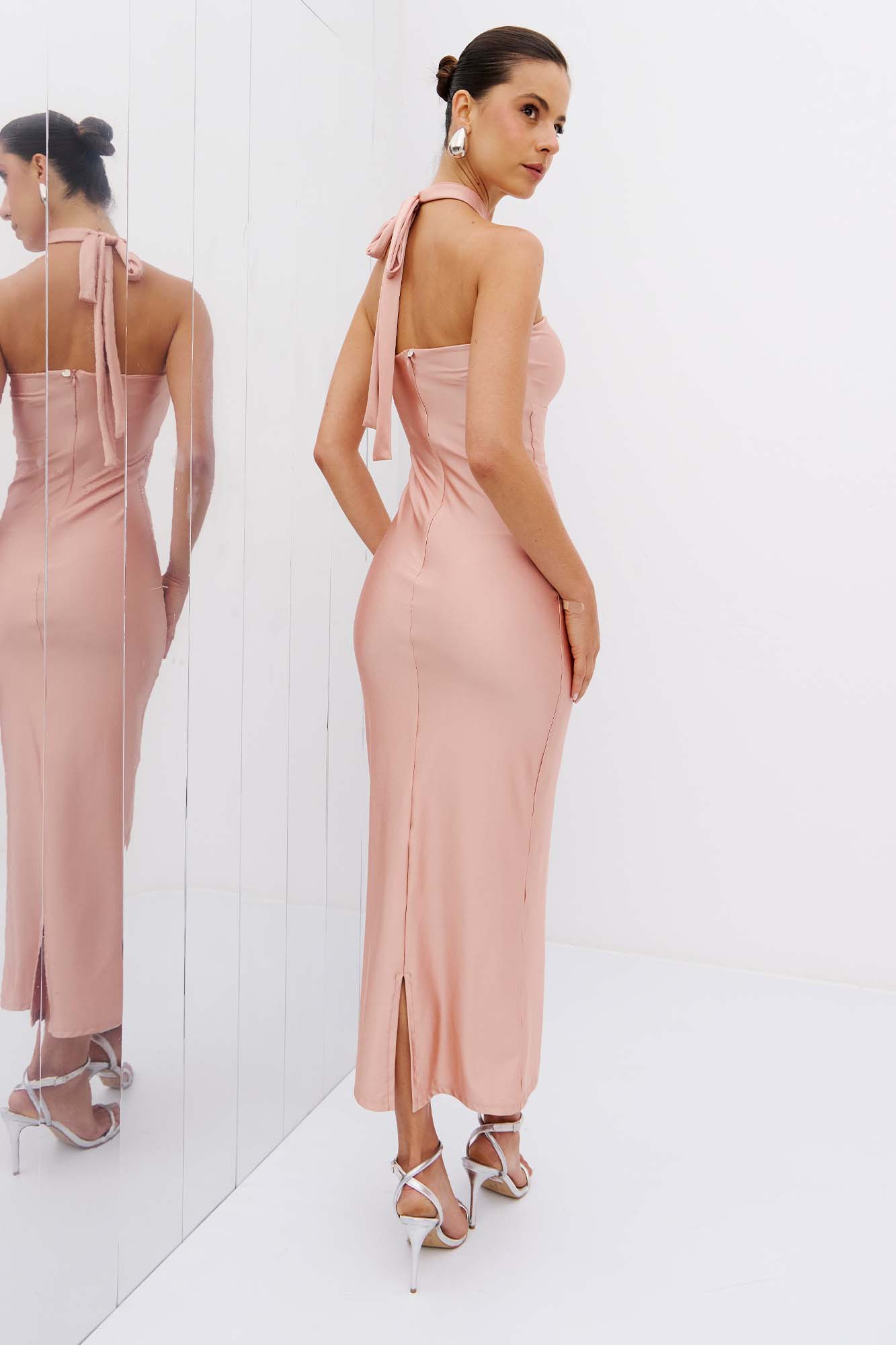 Vestido longo confeccionado em malha shiny sensitel com elastano, que garante caimento e efeito acetinado. Possui bojo na frente e fechamento por zíper invisível nas costas, para maior conforto e ajuste ao corpo. O detalhe em destaque é a gola choker embutida e a aplicação de argola em metal, que valorizam o pescoço. Dica: perfeito para festas ou eventos noturnos, combine com sandália de tiras finas e clutch metálica para um look imponente. 78% POLIAMIDA 22% ELASTANO.