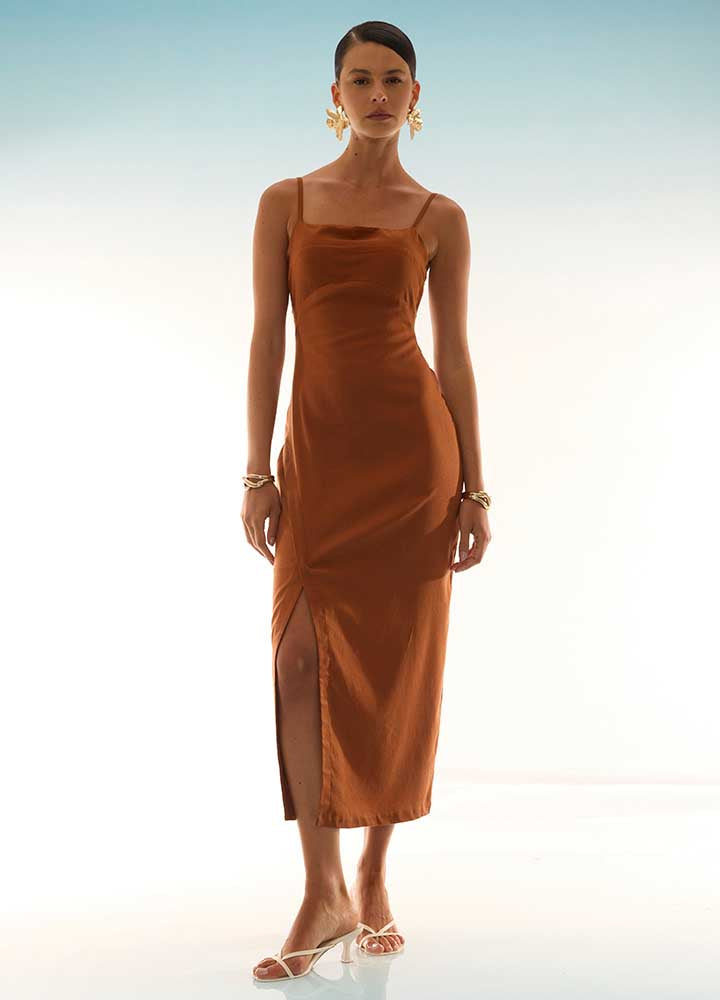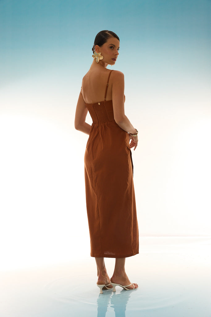 Vestido confeccionado em linho. Com um top estruturado duplo e bojo, este vestido garante maior segurança durante o uso. As alças com reguladores proporcionam um ajuste ideal, enquanto o forro e o recorte de lastex na parte posterior garantem um acabamento refinado. A abertura é feita por um discreto zíper invisível. Com uma fenda frontal transpassada, este vestido atemporal é a escolha perfeita para quem busca leveza e frescor em suas produções. Complete o look com sandálias e acessórios delicados para um visual moderno e sofisticado.