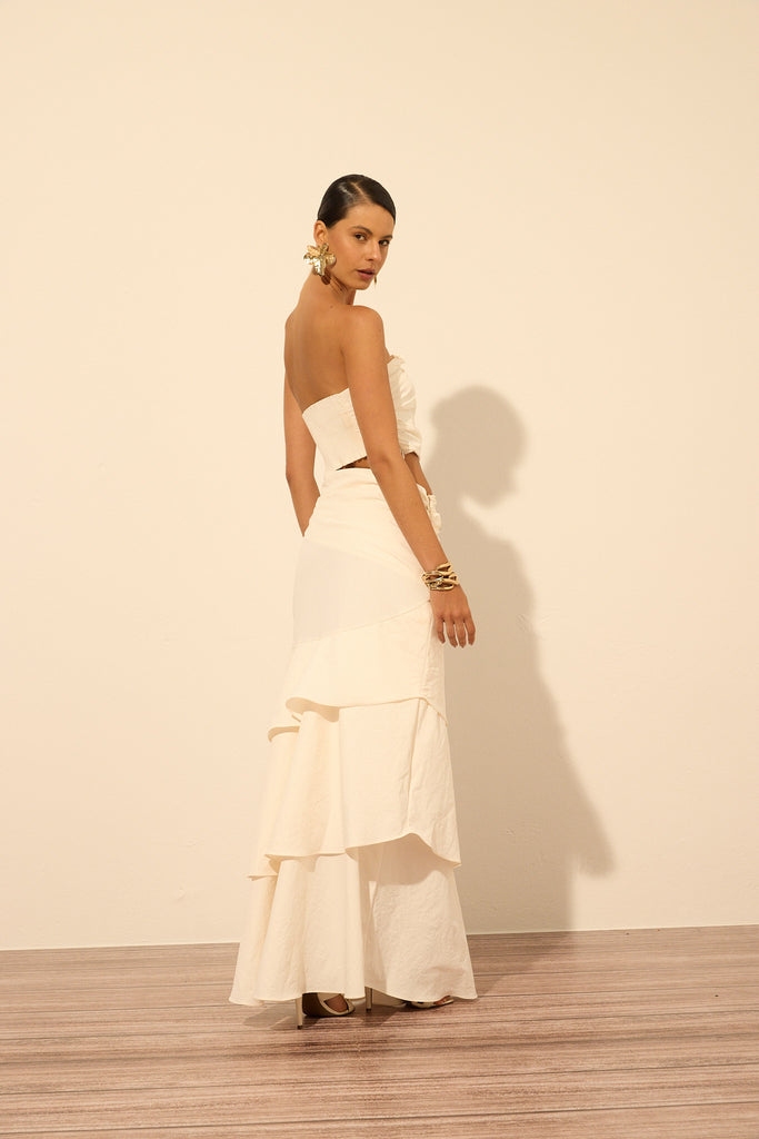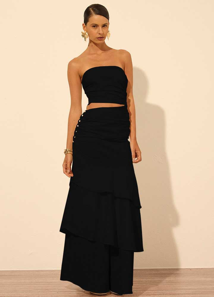 Vestido confeccionado em tecido plano, com um design luxuoso que combina volumosos babados assimétricos e recortes com laterais franzidos, valorizando a silhueta com sofisticação. Possui forro para maior conforto, zíper invisível nas laterais para ajuste perfeito e delicados botões que trazem um toque de elegância. Ideal para ocasiões especiais ou jantares requintados, combine com sandálias de salto e acessórios em níquel para um visual poderoso e moderno.
