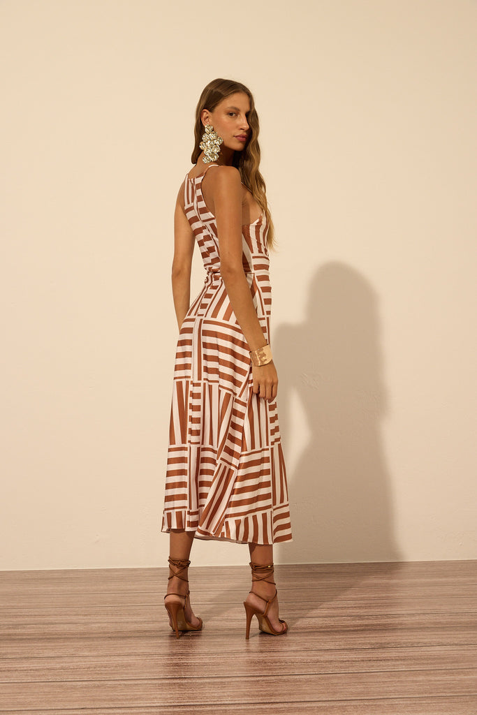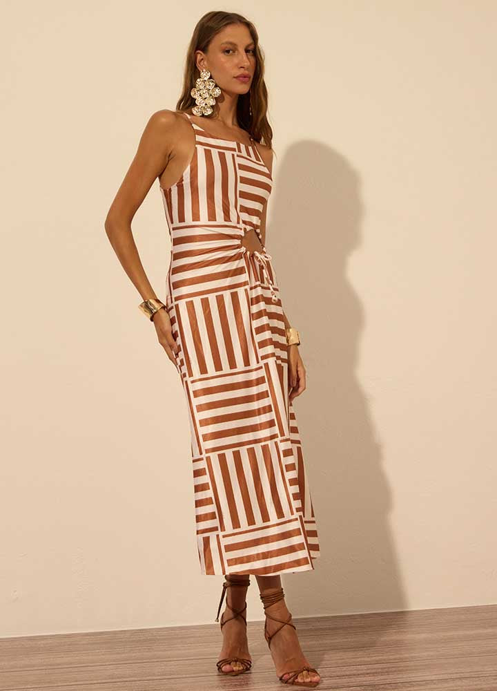 Vestido estampado confeccionado em malha Prada com elastano de acabamento acetinado. A peça possui forro para maior segurança, zíper posterior e uma modelagem leve e fluida que valoriza o corpo com elegância. O destaque fica por conta do cut out frontal franzido, acompanhado de um delicado cordão que adiciona um toque feminino. Combine com rasteiras para dias ensolarados e aproveite ocasiões ao ar livre com charme e praticidade.