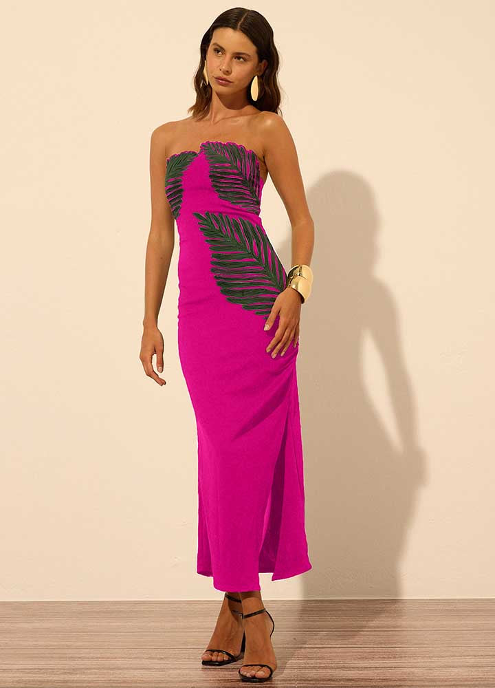 Vestido tomara que caia confeccionado em malha fit crepe com elastano e forro, perfeito para eventos especiais que pedem uma peça glamourosa. Possui bojo, alças removíveis com reguladores e fechamento posterior por zíper invisível, aliando praticidade e conforto. Destaque para a fenda lateral, que traz sensualidade, e a aplicação de folhagens texturizadas, que confere um toque exclusivo. Para um look impecável, use sapatos e acessórios metalizados.