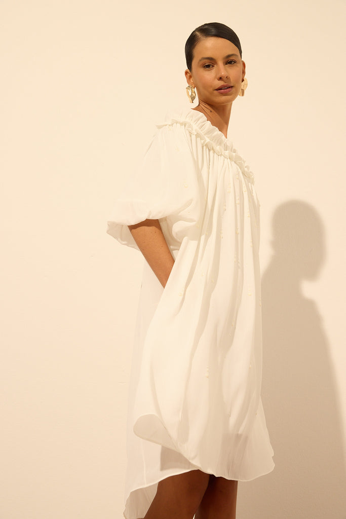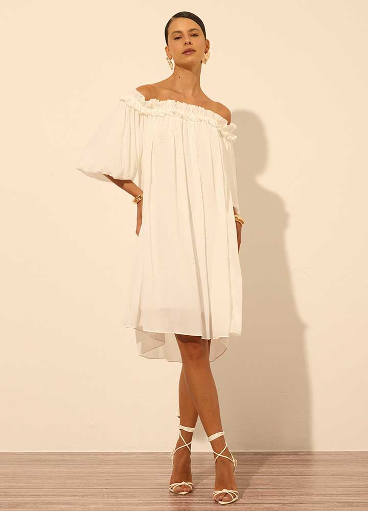 Vestido confeccionado em tecido plano com forro, combina leveza e sofisticação com seu decote ombro a ombro e barra franzida que valoriza a peça. As pérolas aplicadas na frente acrescentam um toque exclusivo e refinado, enquanto a modelagem fluida garante conforto e elegância.