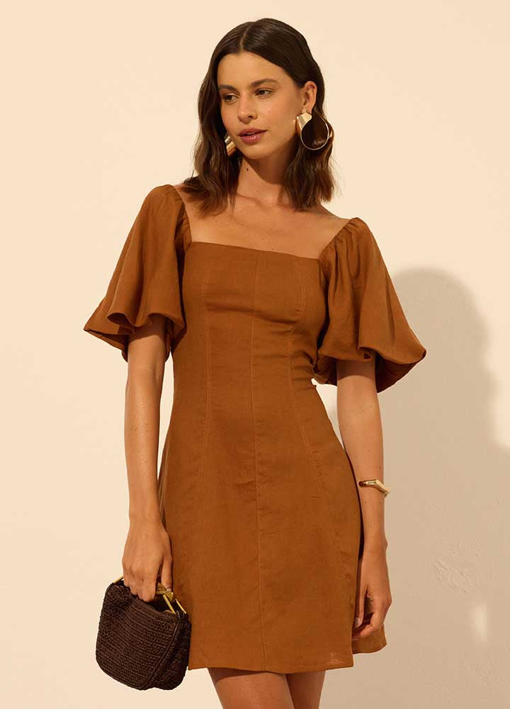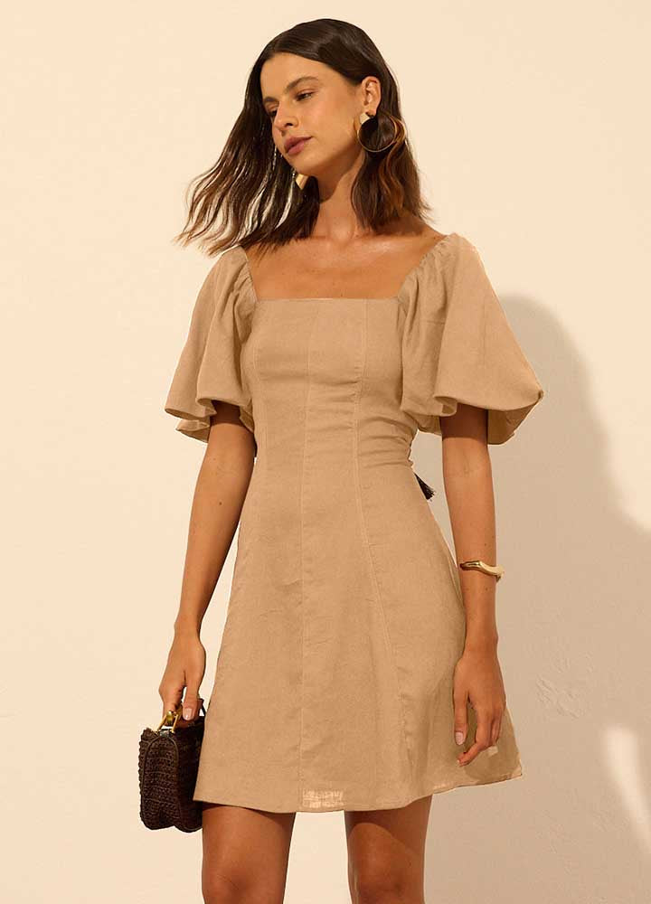 Vestido ombro a ombro godê, confeccionado em linho Milano, perfeito para composições cheias de leveza. O modelo apresenta mangas bufantes com volume, costas abertas com delicada amarração e recortes pespontados. Forrado para maior conforto, conta com zíper invisível na parte posterior. Combine com sandálias de salto bloco e acessórios naturais para um look fresco e sofisticado.