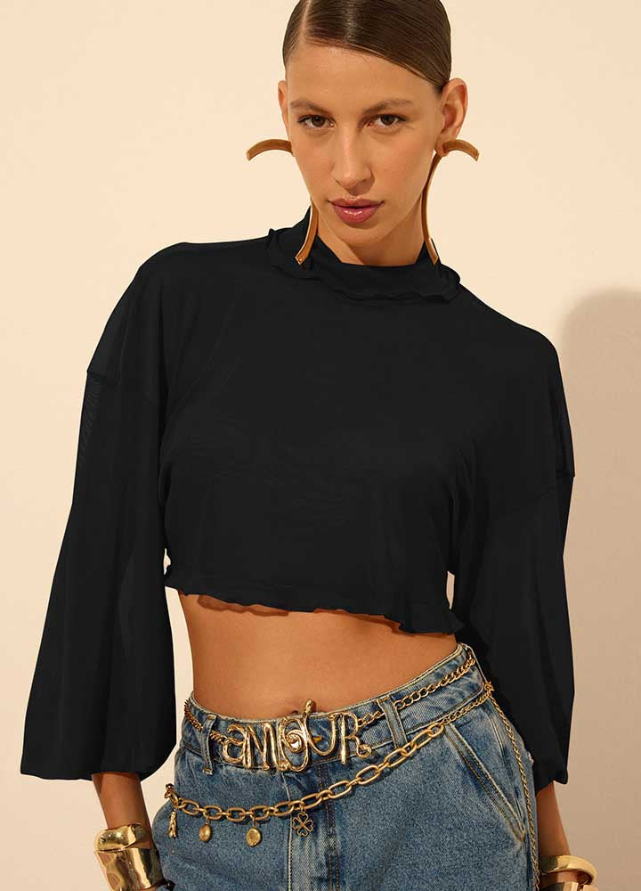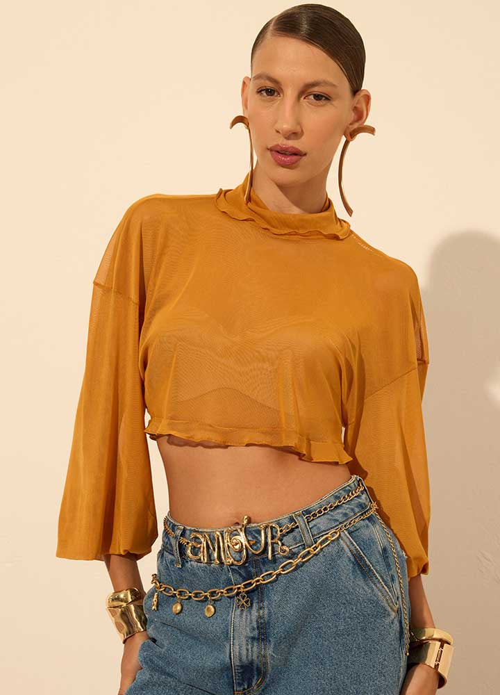 A blusa confeccionada em tule focus. Com mangas bufantes finalizadas por elástico, ela traz volume e leveza, enquanto a gola alta e os babados delicados ao redor da barra e do decote adicionam um charme romântico. A transparência do tule confere à peça um ar ousado, ideal para compor looks femininos com a estética atual Boho Chic.