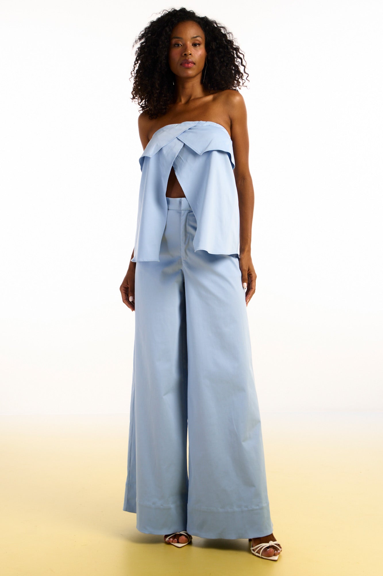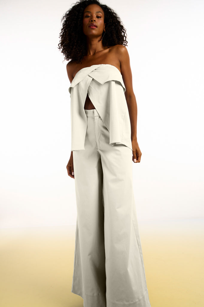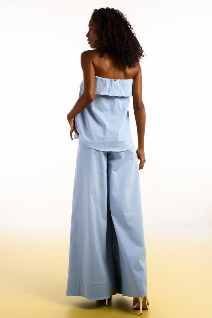 Calça pantalona confeccionada em tecido plano. A peça possui dois bolsos funcionais na parte frontal e pences na parte posterior, que proporcionam melhor ajuste ao corpo. A barra é larga, trazendo sofisticação ao visual. O fechamento é frontal, com zíper, braguilha e colchete interno. Dica de look: combine com a blusa strapless do mesmo material, da coleção City Blue, para um visual monocromático e moderno.