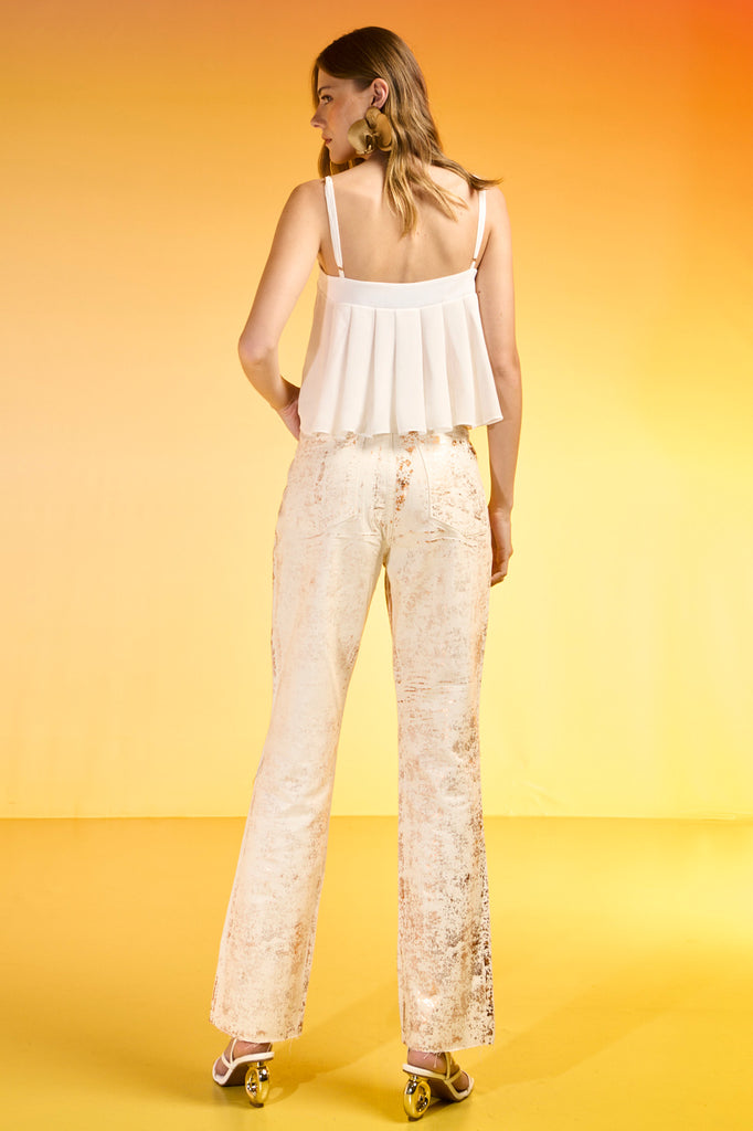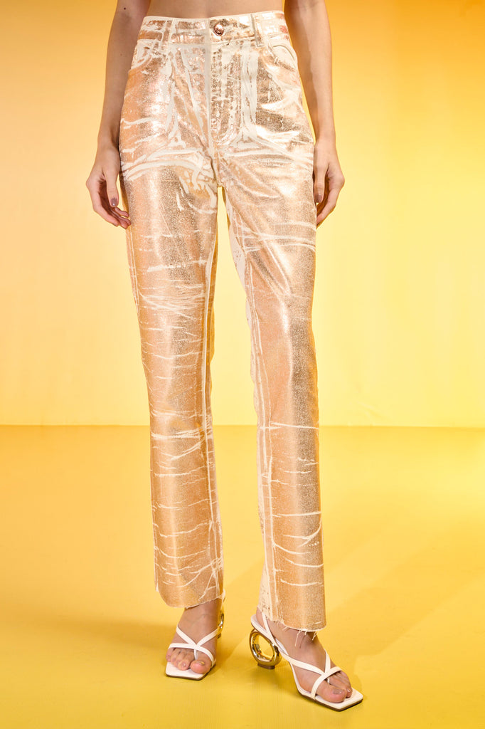Calça pantalona de cintura alta, confeccionada em jeans amaciado com foil metalizado. A peça apresenta cós com passantes aplicados, três bolsos funcionais na parte frontal e dois na parte posterior, pala e barra com acabamento de corte a fio. O fechamento é frontal, por botão e zíper de metal. Dica: Com seu design autêntico, combine essa peça com uma regata branca para um visual mais despojado ou com blazer preto para um look mais sofisticado.