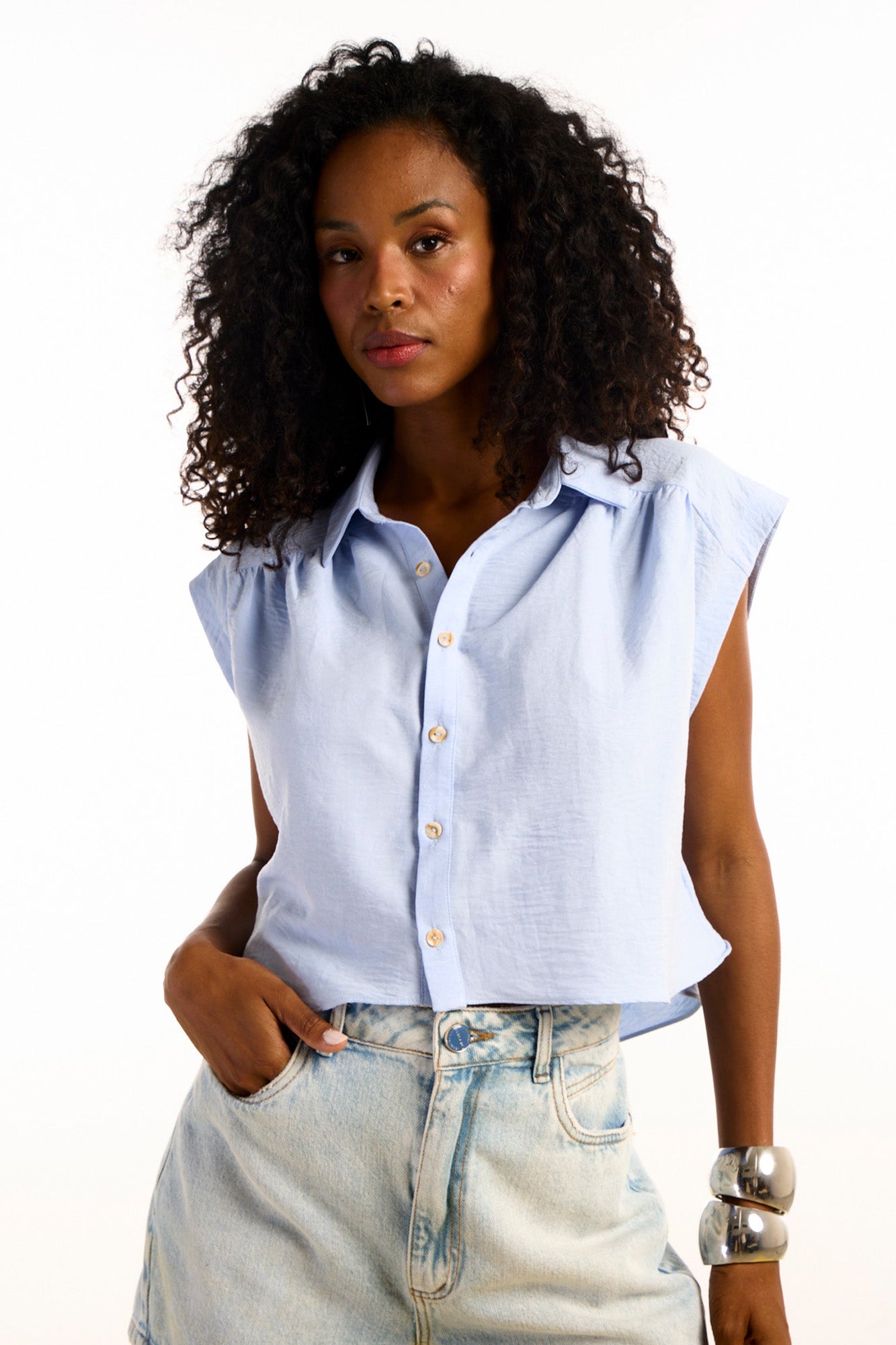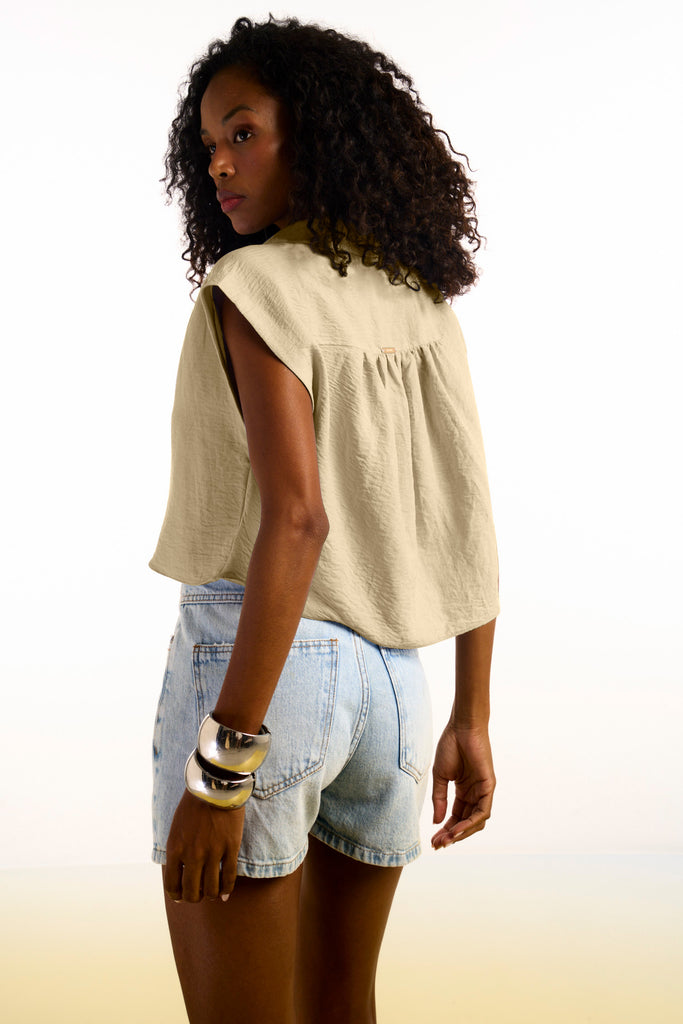 Camisa confeccionada em tecido plano. Possui modelagem leve e fresca, com gola colarinho clássica e abertura por botões. Conta com detalhes de recortes franzidos na parte frontal e posterior, que trazem um toque de delicadeza. Ideal para compromissos casuais ou um passeio no fim de semana.