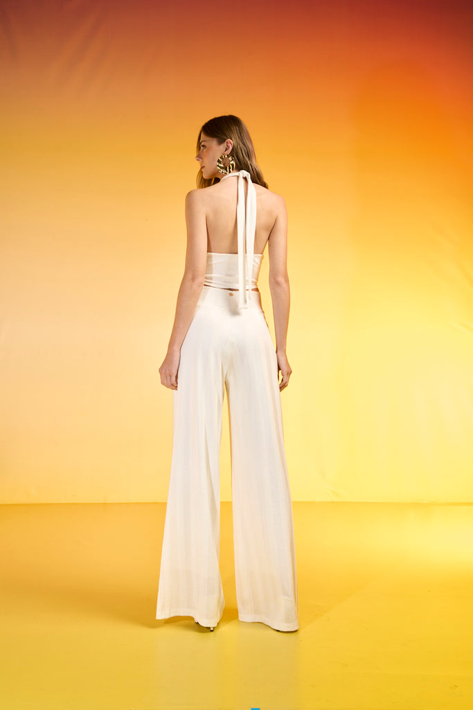 Cropped confeccionado em tecido plano com padronagem listrada e acetinada. O destaque fica por conta da abertura frontal com argola orgânica em metal dourado, que adiciona um toque sensual e luxuoso à peça. Ideal para ocasiões especiais.