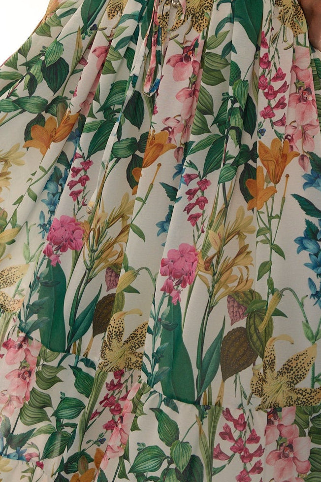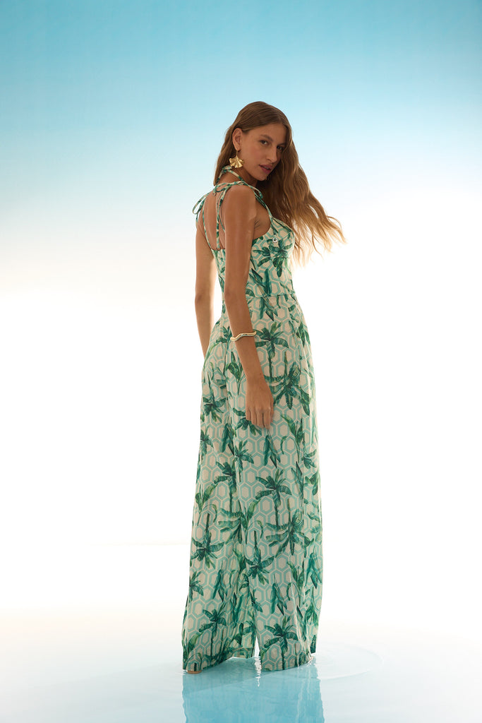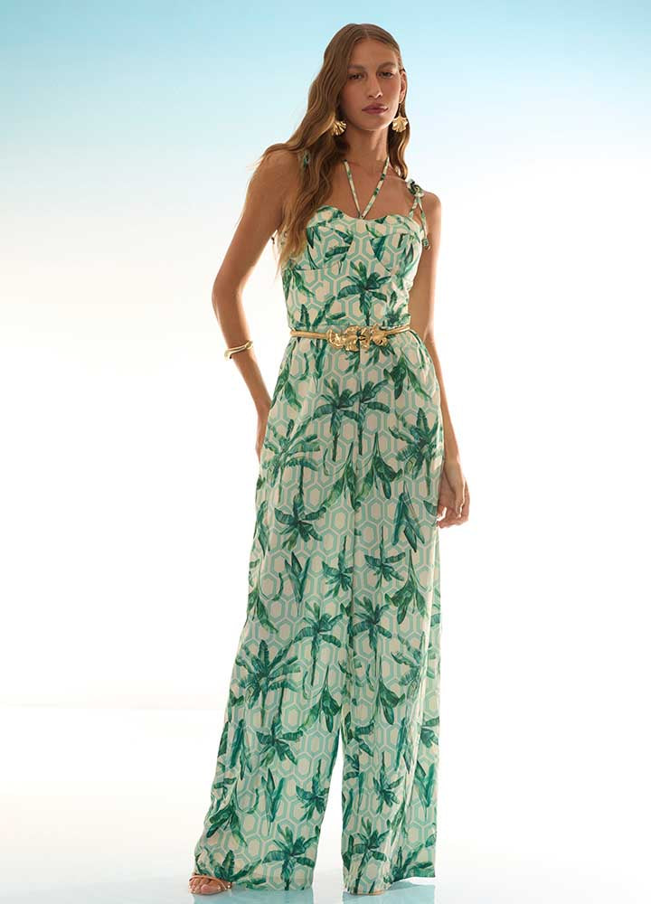 Macacão confeccionado em tecido plano estampado. A peça conta com top estruturado por entretela, recortes e bojo no busto, proporcionando suporte e realçando a silhueta. As amarrações delicadas na parte frontal e nas alças acrescentam um toque feminino. A calça ampla garante um movimento fluido, enquanto os bolsos funcionais oferecem praticidade. Com zíper invisível e pences na parte posterior, o caimento é impecável. Combine com sandálias de salto para um look refinado e cheio de personalidade, ideal para ocasiões especiais.
