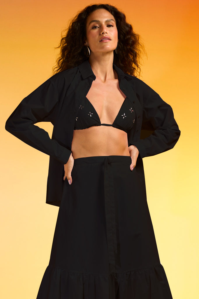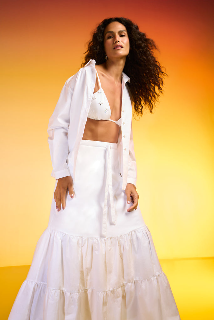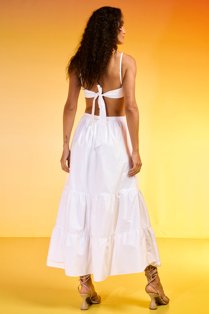 Saia longa confeccionada em tecido plano. Possui forro e elástico nas costas para maior conforto. Sua modelagem super franzida proporciona um toque romântico e movimento ao look, tornando essa peça ideal para ocasiões tanto diurnas quanto noturnas. Para finalizar, a peça conta com um delicado laço no cós frontal.