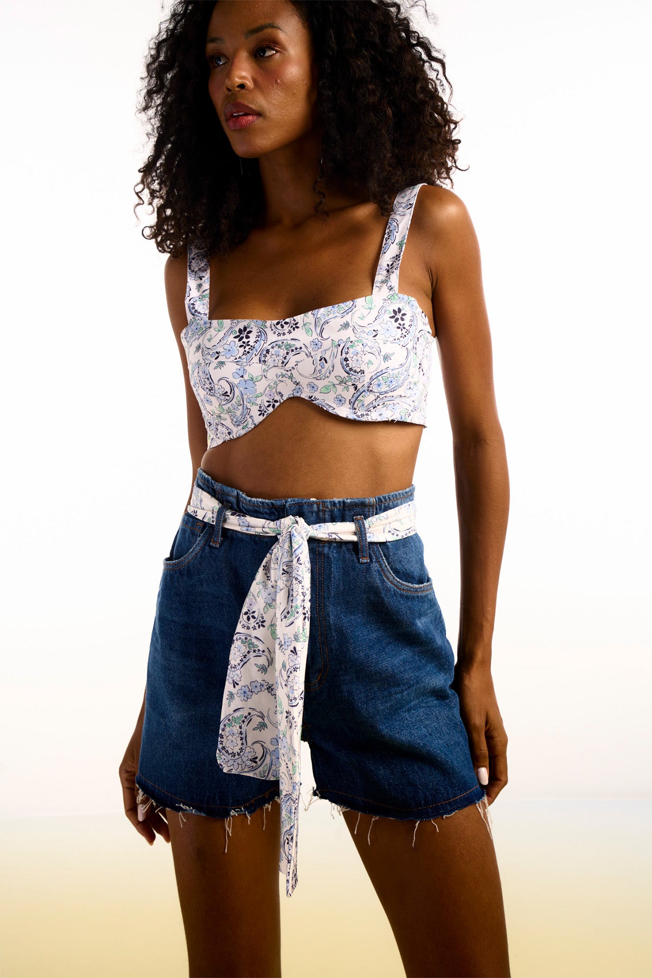 Short de cós alto confeccionado em jeans de lavanderia escura. A peça possui passantes aplicados, três bolsos funcionais na parte frontal e dois bolsos tradicionais na parte posterior. A barra tem acabamento com corte a fio, e o fechamento é frontal, com zíper de metal. O destaque fica por conta do cinto de amarração com estampa exclusiva City Blue, que acompanha a peça, trazendo um toque vibrante e valorizando a cintura com estilo.
